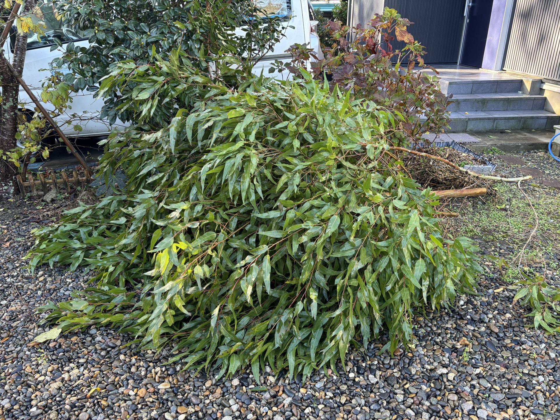 我が家のシンボルになりつつあった、ひょろひょろと伸びたユーカリの木が途中から折れて、倒れてしまっていた。
