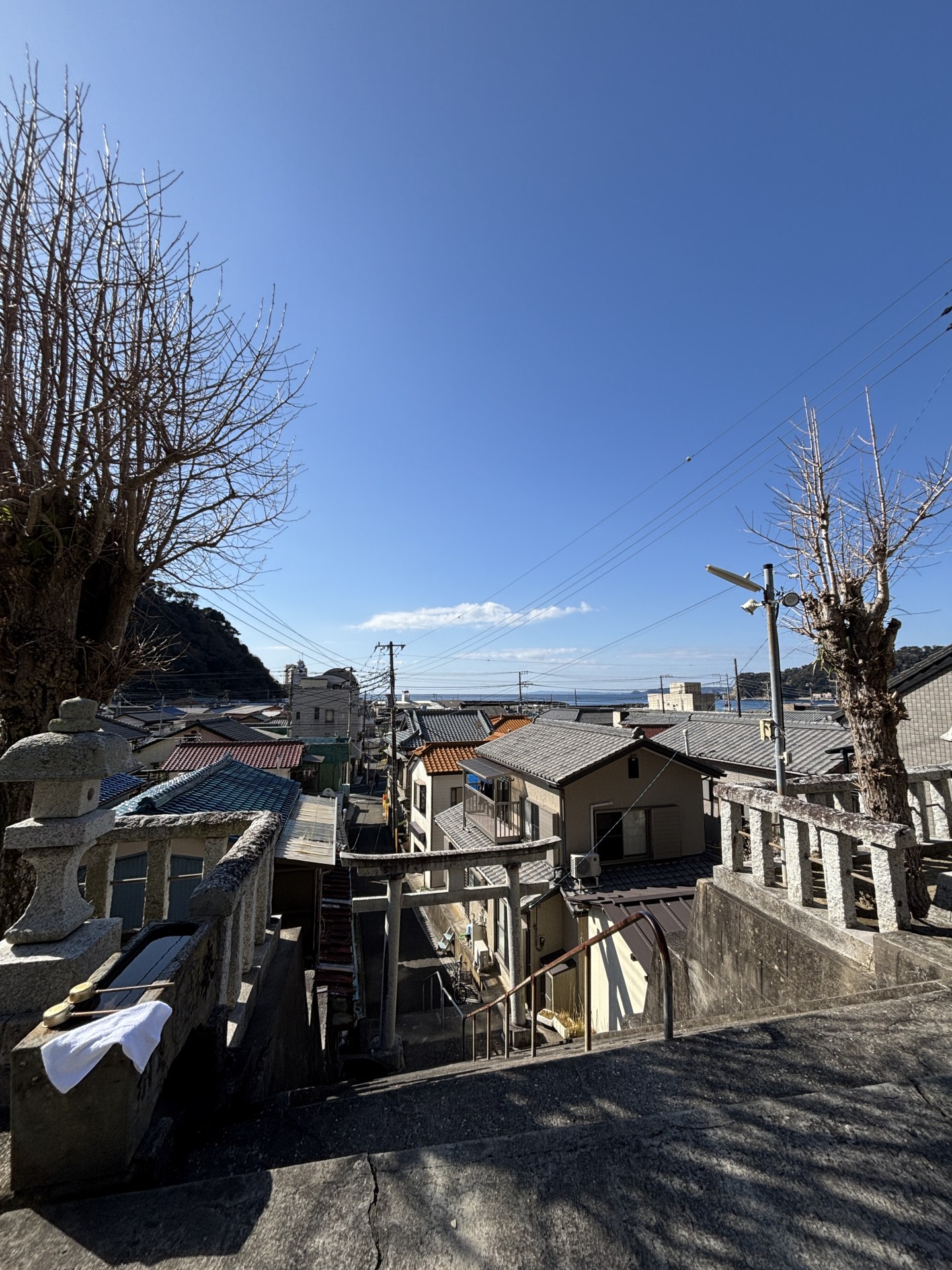 小湊の町並みを望む場所にあり、今日は抜けるような青空で、遠くには海がきらきらと輝くすばらしい光景だった。