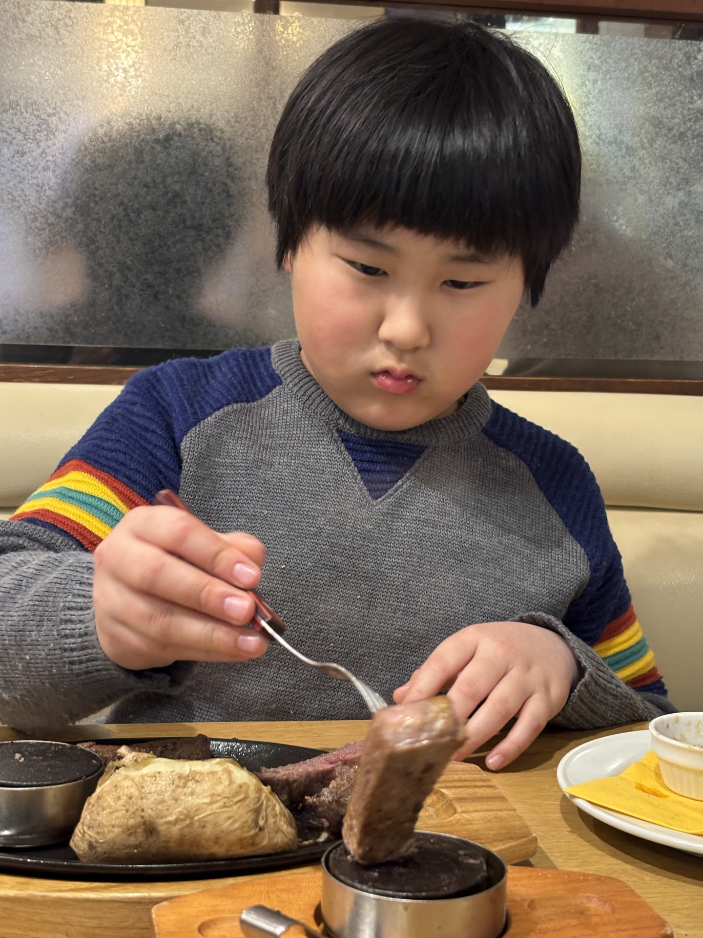 肉と真剣勝負しながら、結構大きなステーキを完食していた。
