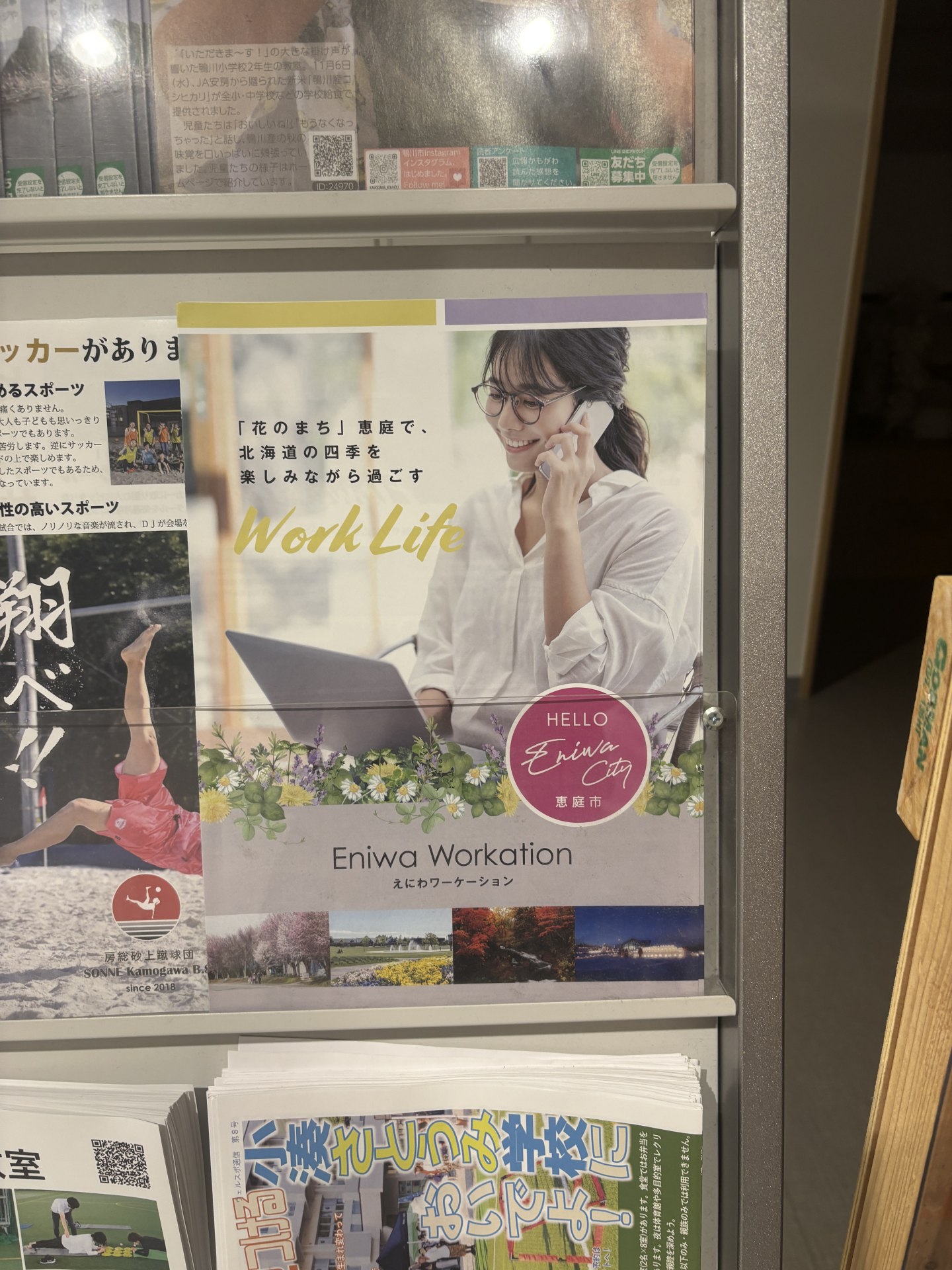 [写真:恵庭市から送られてきたワーケーション冊子をさっそく配架