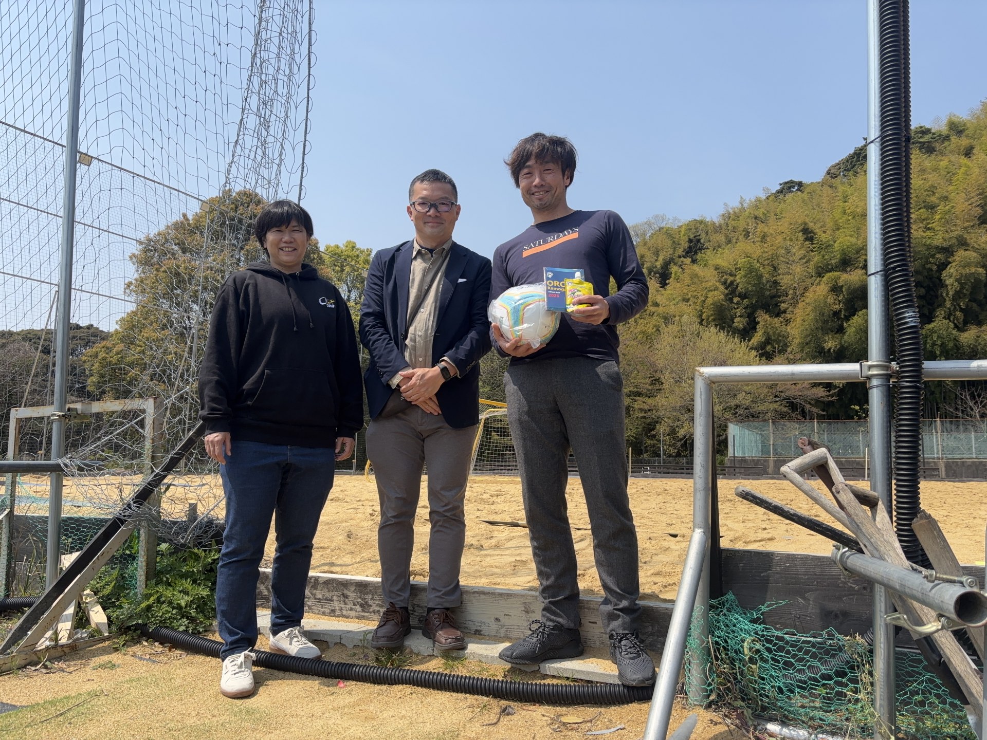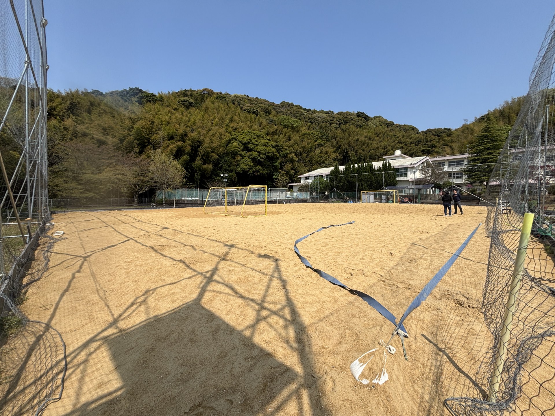 北九州空港からはレンタカーに乗り、まずは、ラソ・アペーゴ北九州が廃校のグラウンドを活用して開設したビーチコートを見学させていただく。