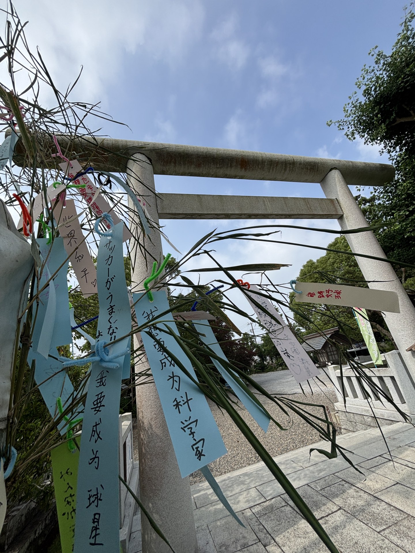 昨夜、ビーチコートで日中の子どもたちにしたためてもらった七夕の笹飾り、短冊を神社の参道に飾った。