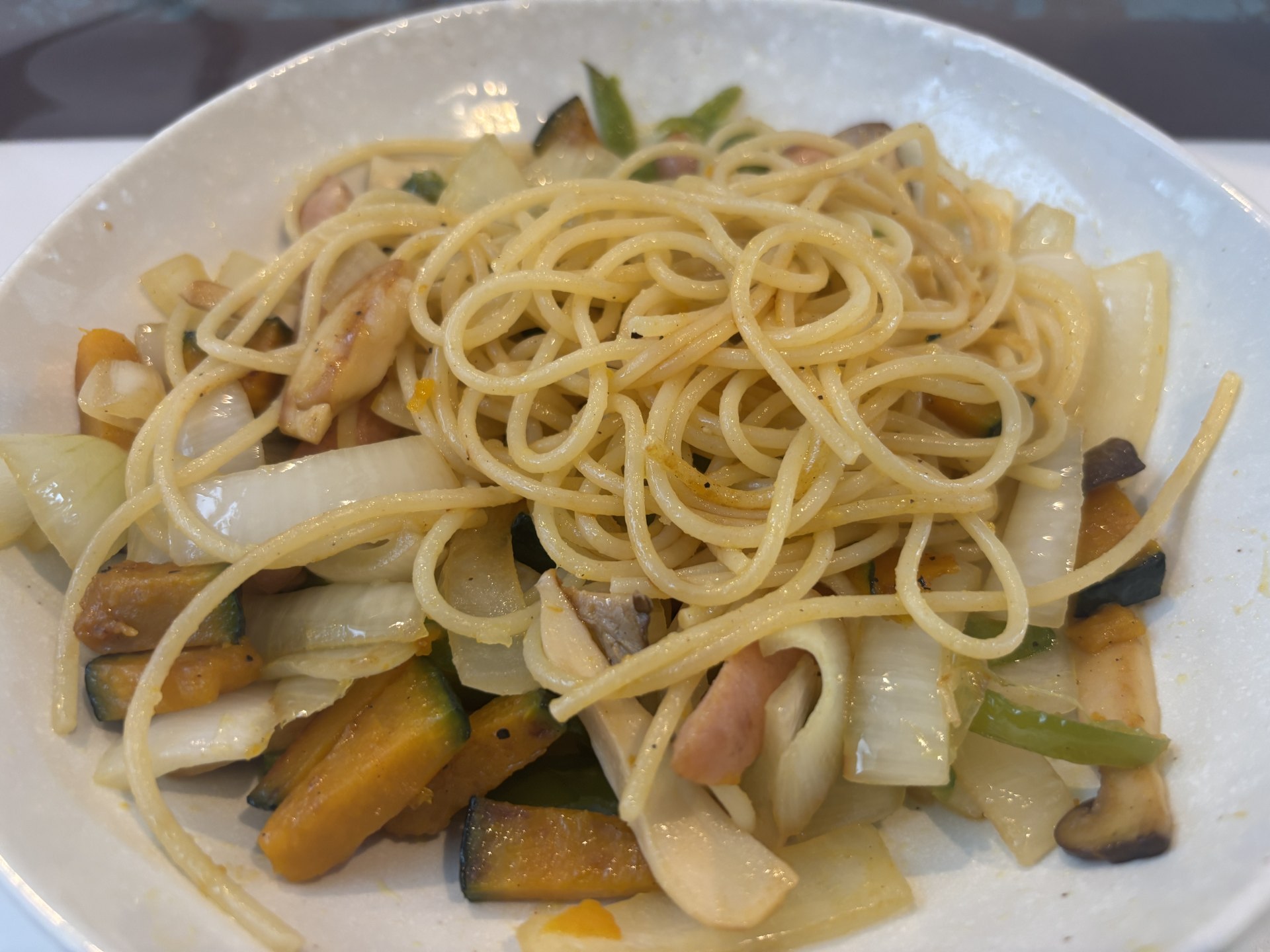 [写真:昨日の家焼肉の余り物で、パスタなんぞ。笑