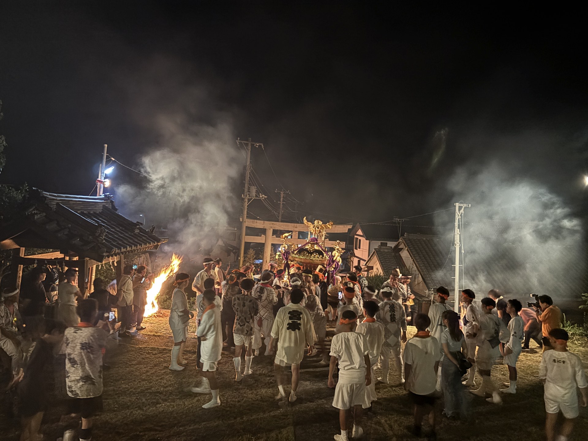 [写真:松明が焚かれる中、境内に上がってきた御神輿