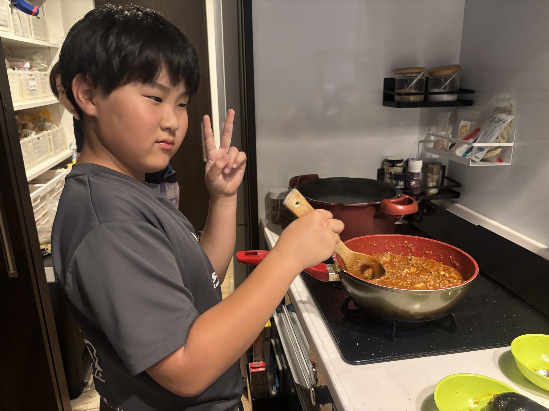 夕飯はいぶたんお手製のミートソース・スパゲッティ。