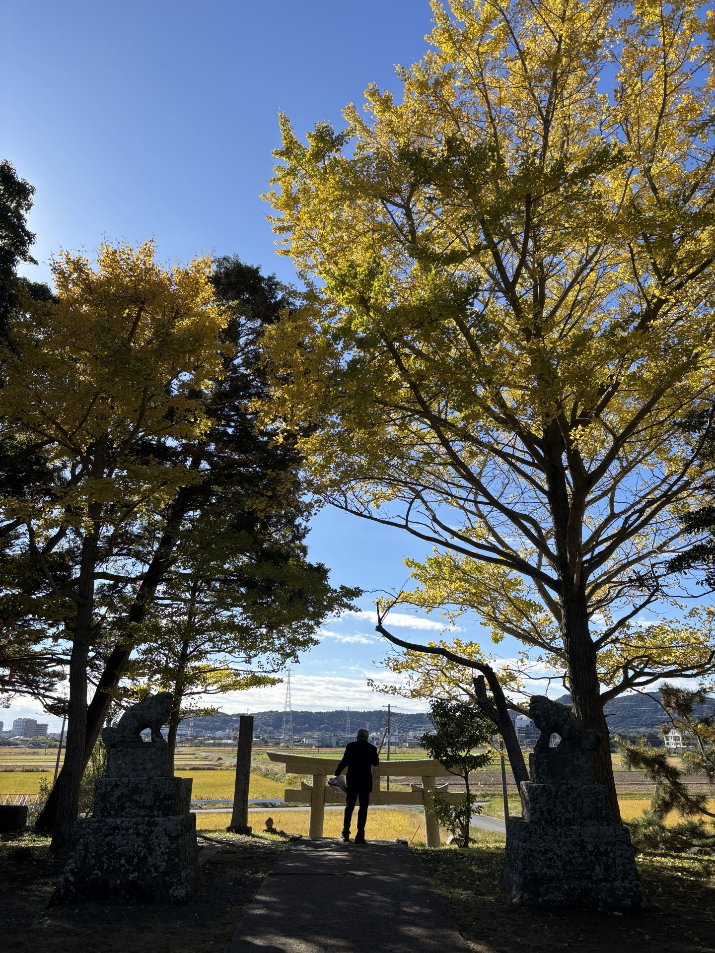 [写真:八坂神社の見事に紅葉した銀杏の木とその背景に広がる田園。ここが菜な畑ロードの会場にもなる。