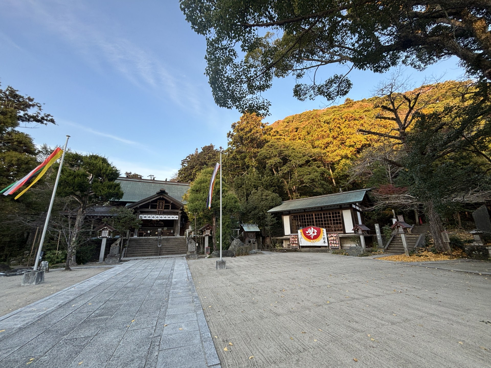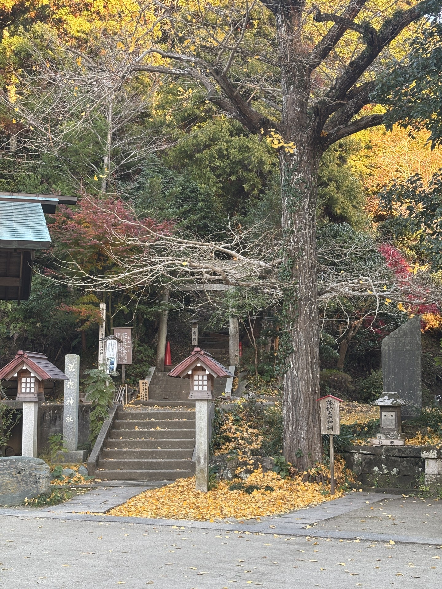 ちょっと休んでいる間に境内の銀杏の葉はほとんど全て落ちてしまい、樹木の下には黄色いじゅうたんができあがっていた。