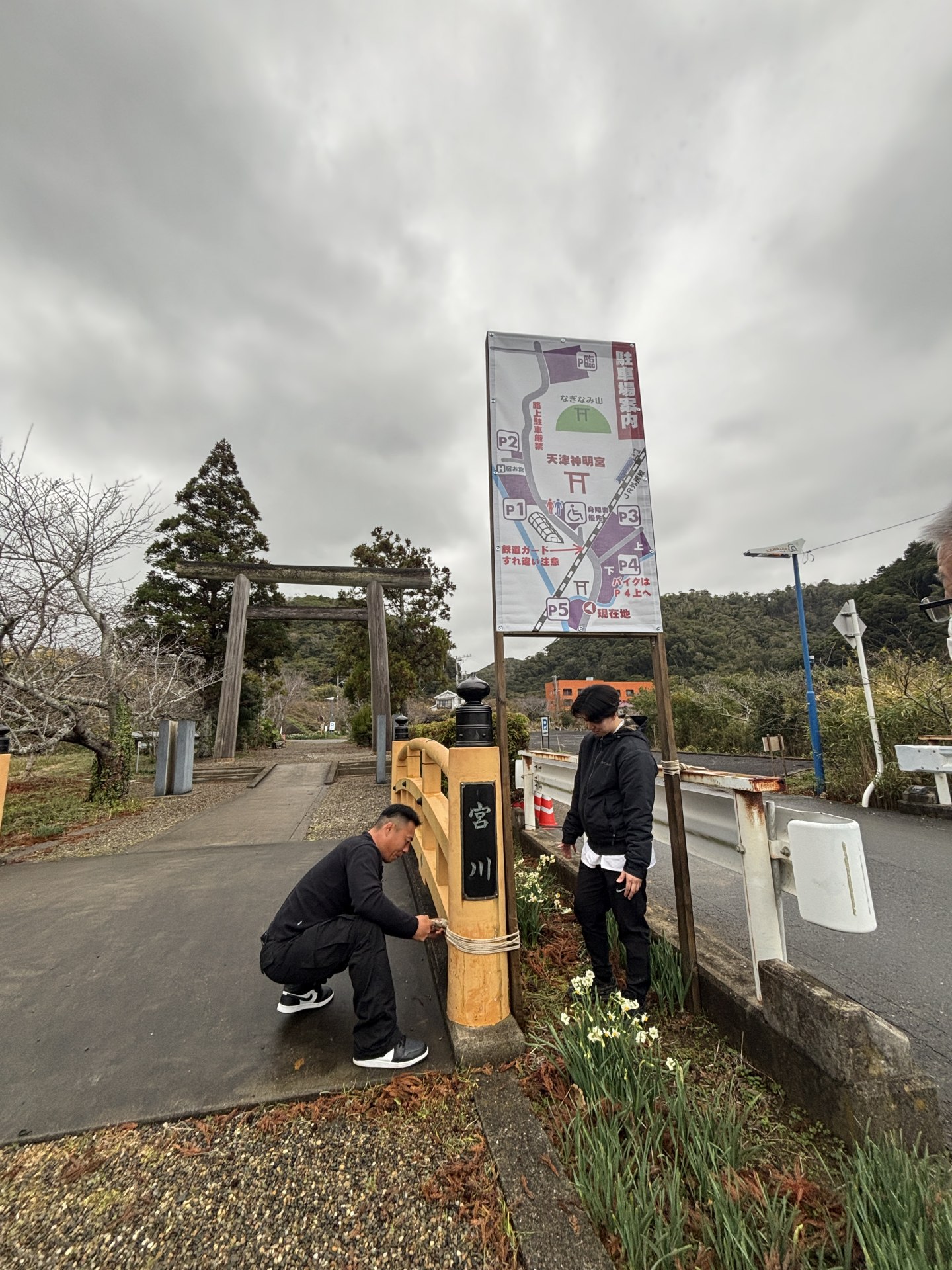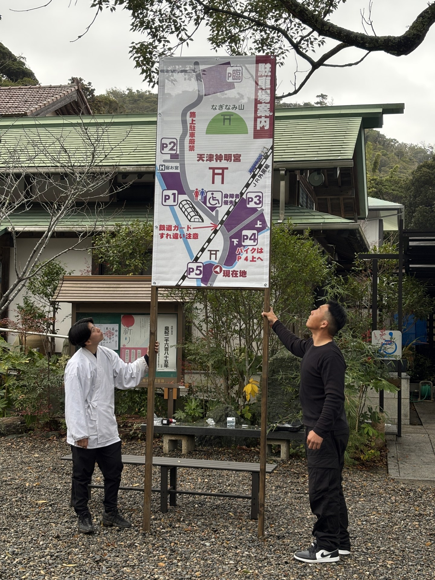 打ち合わせ後、今年初めて試みる駐車場看板の設置作業。