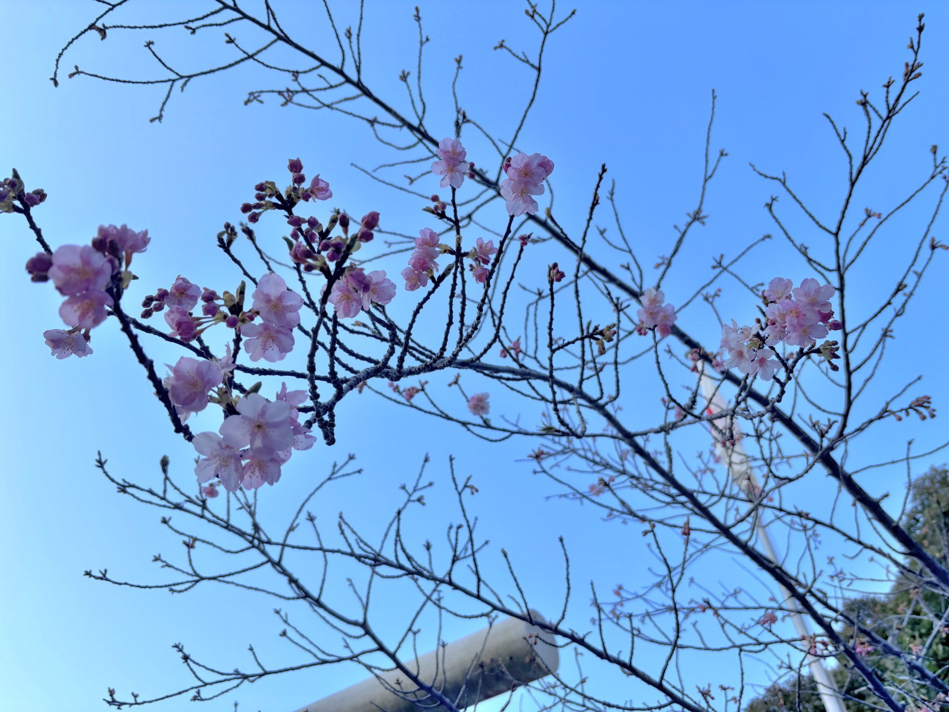 [写真:札所前の河津桜はスローペースで開花中。見頃は来週末かな?