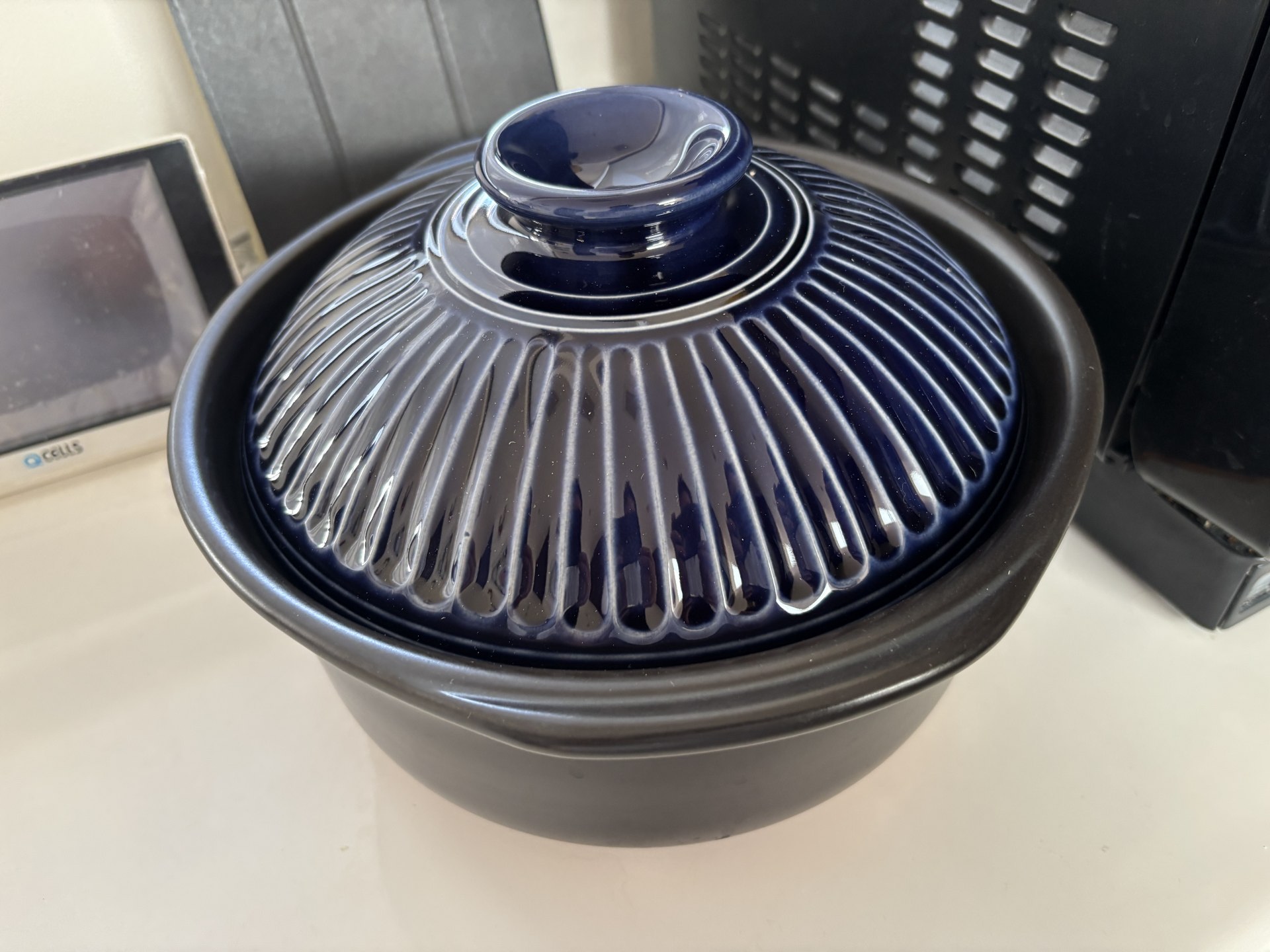 [写真:二男が先日落として割った、愛用の炊飯土鍋の蓋が届いた。瑠璃色にしてみた。