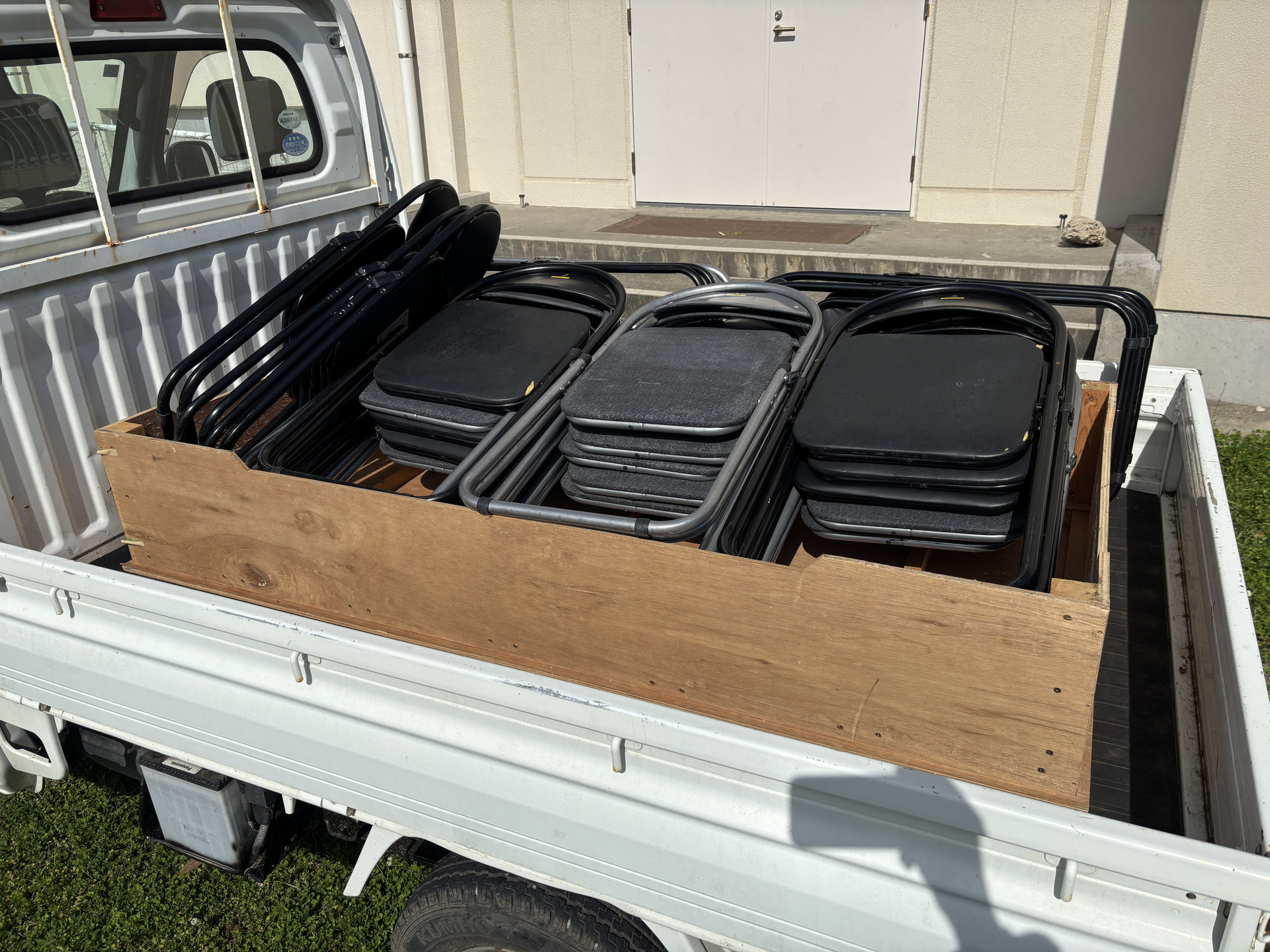 急遽増席することにして、かっぺビルから以前小湊さとうみ学校に寄贈した折りたたみイスを拝借することにして、運搬作業などを行った。