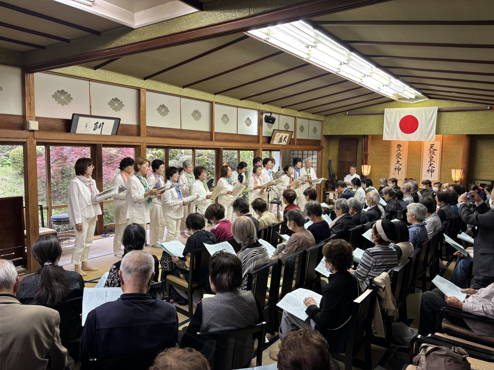 野口雨情が当時宿泊していた中屋旅館(現在の「宿中屋」)の伝から、都内にお住まいで野口雨情の研究をされている方、そして、野口雨情の生家がある北茨城市にお住まいの野口雨情のお孫さんとつながり、今日はお孫さんをゲストに招いて、第1部はお孫さんによる野口雨情と童謡に関するトーク。第2部は地元コーラスグループ「神人和楽会」「カールモ」の共演による、童謡の合唱、そして、最後は「天津小唄」の合唱、舞踊が行われた。