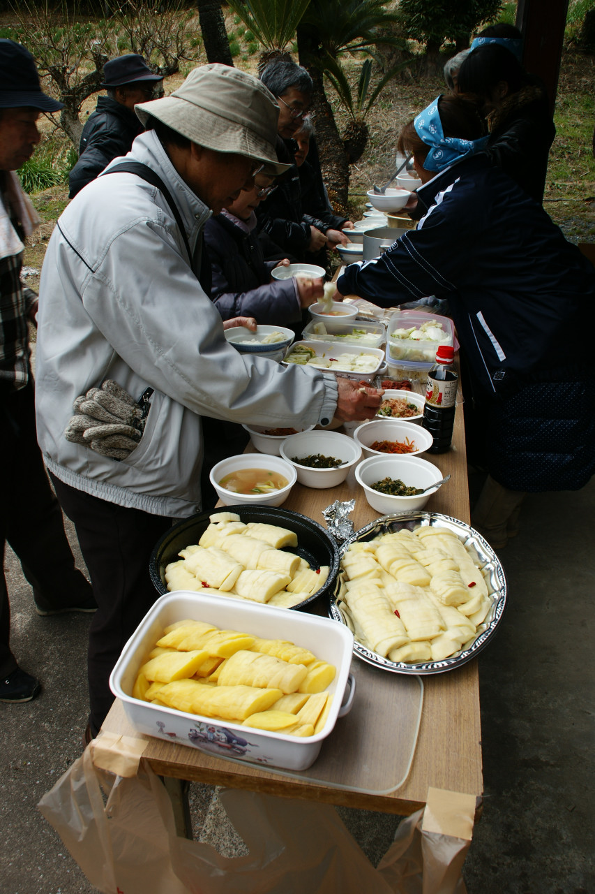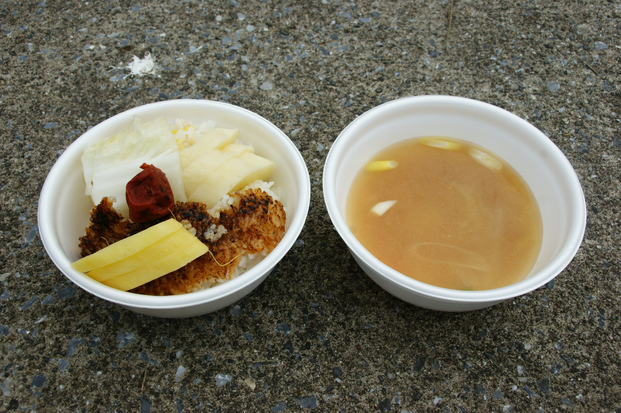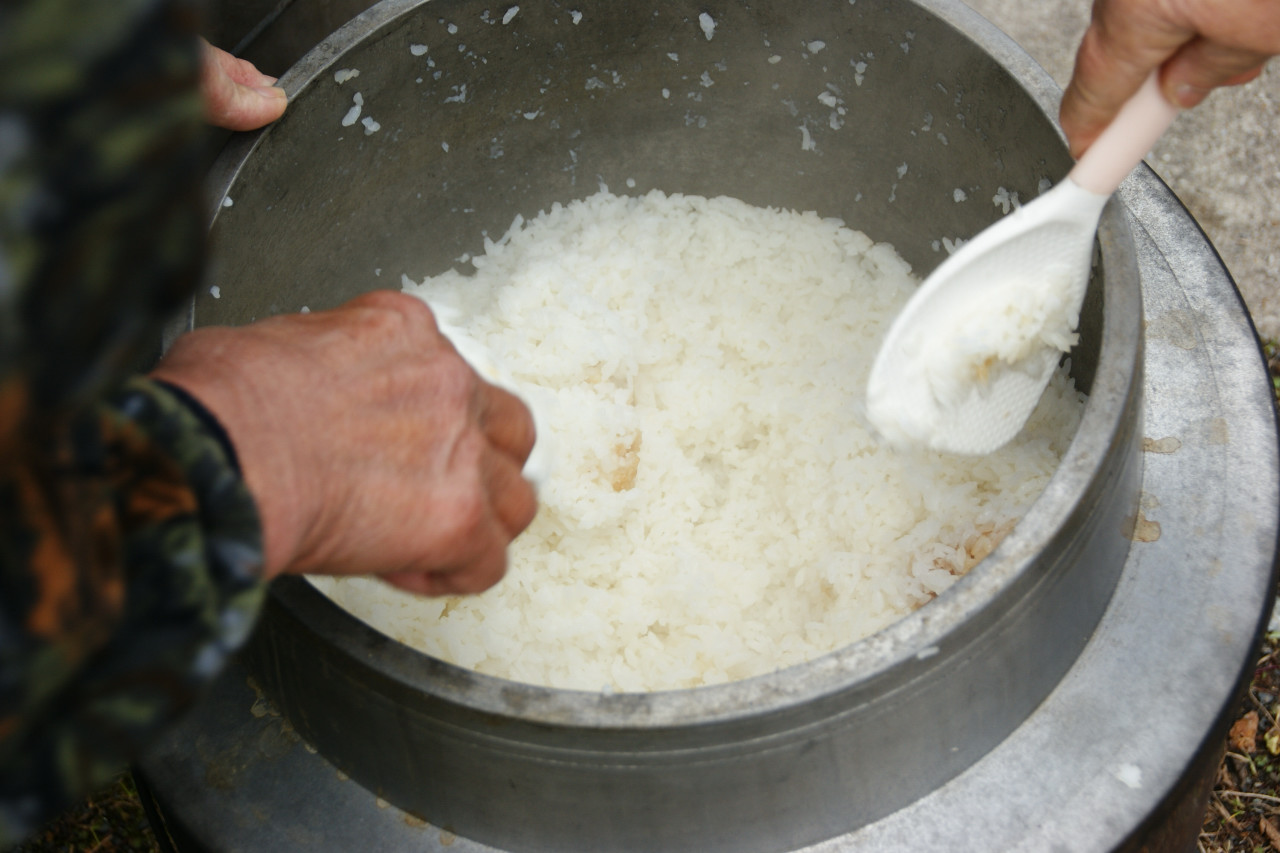今日はなんと、地元畑地区で収穫されたご飯をお釜で炊き上げ、味噌汁と地元お手製の漬物でいただいた。