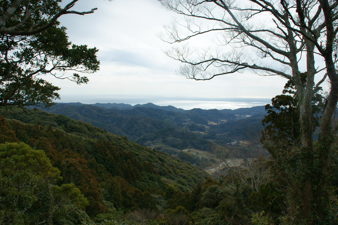 山頂は地元の方々が雑木を伐採したこともあり、視界が大きく開けており、南側には太平洋、西側には遠く富士山まで望める雄大な景色を楽しむことができる。