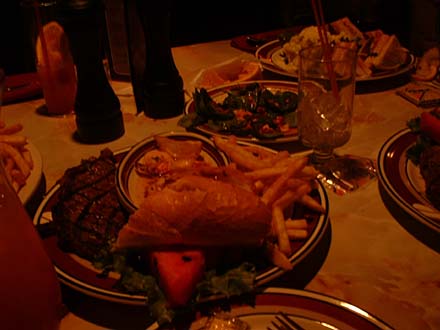 カクテルを飲みながらステーキを食べる。