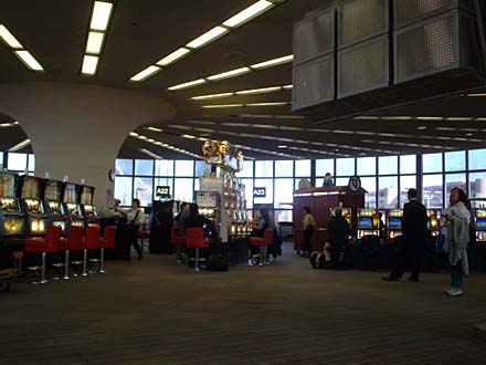 搭乗口に行くと、その待合場にもスロットマシーンが並んでいる。