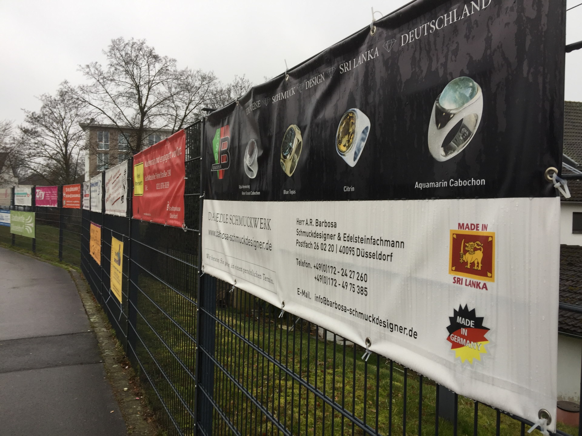 練習場のピッチサイドには広告看板も立てられており、おおよそ5万円程度の広告料(看板は広告主が別途負担して作成)とのことで、地域の企業や商店が各クラブを応援しているのだという。