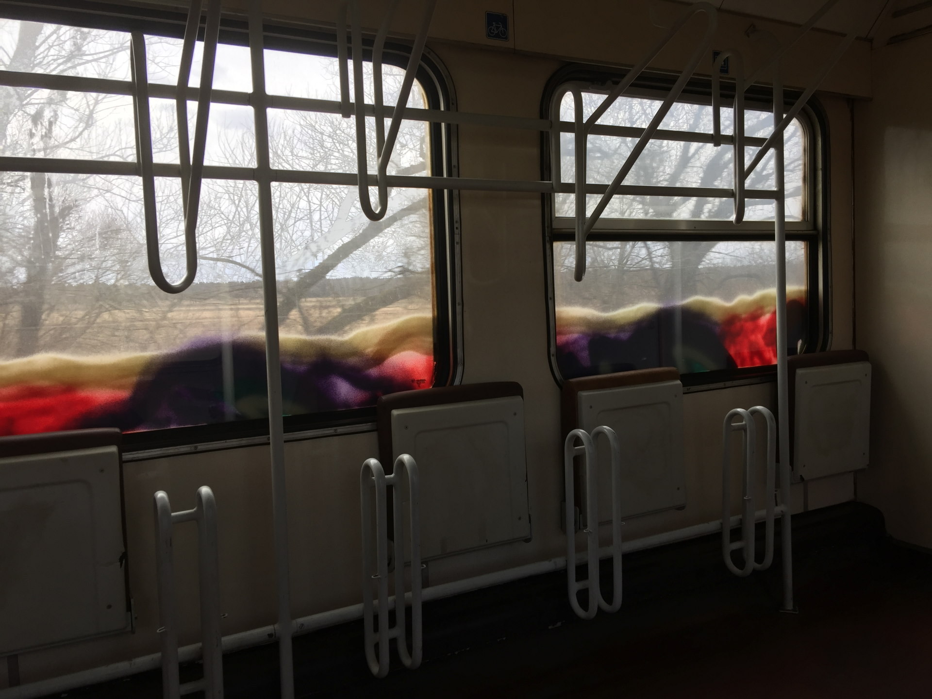 [写真:落書き車両に乗車。ご覧の通り。ヨーロッパの列車は自転車専用スペースもある。サイクリストにはうれしい。