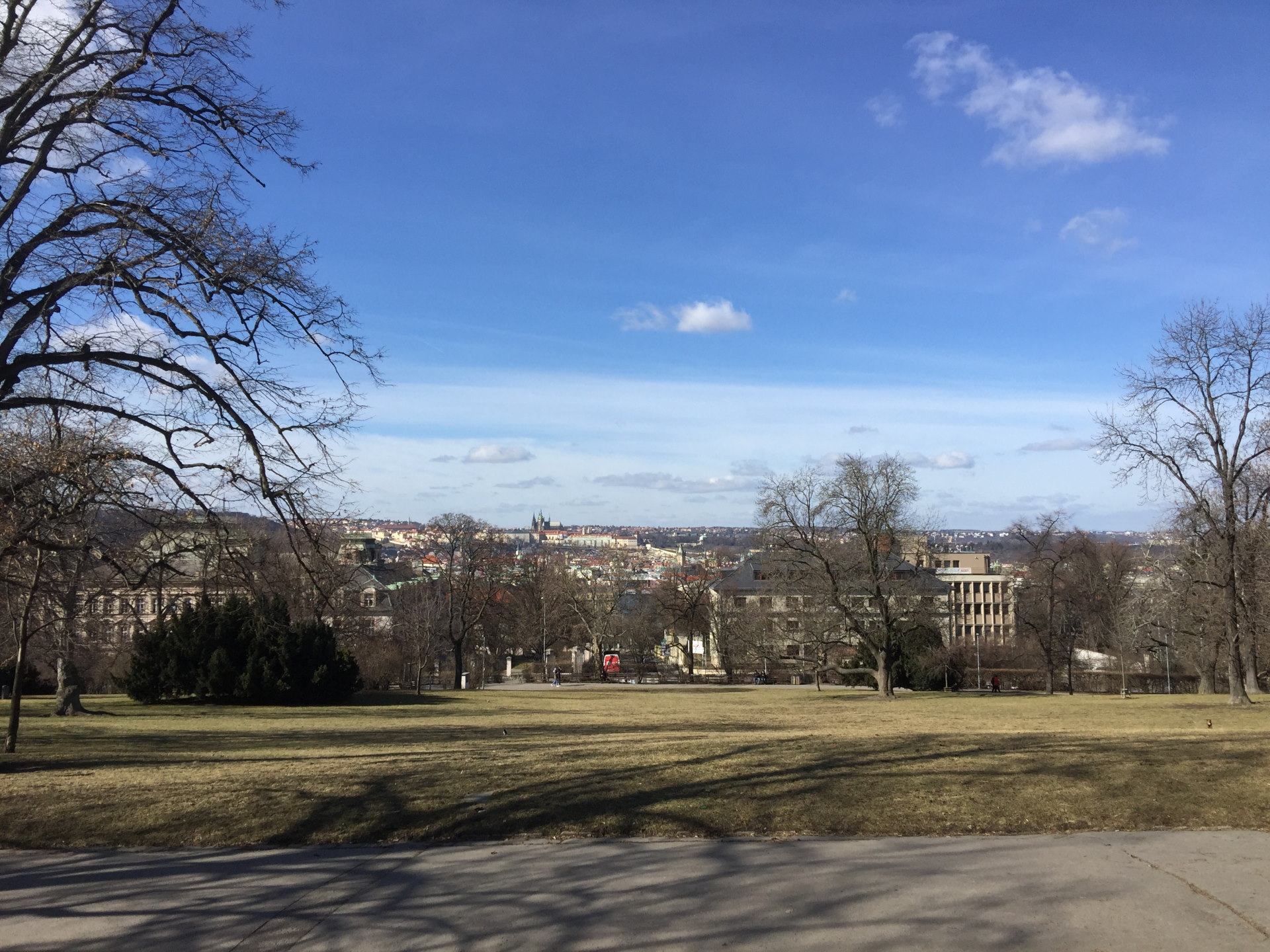 駅の反対側は急な斜面になっているようで、坂道を登るのに一苦労。すると公園に出て、そこからはプラハの眺望を楽しみながら(楽しむ余裕はないけど)、駅の方向に向かって降りていく。