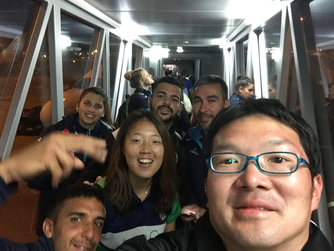 飛行機の中ではなんと後方に陣取ったチームの席で酒盛りが始まったらしく、私とあやのの席は前方だったため、スタッフが「あやの、あやの、来い!来い!」と誘いにやってきて、そりゃまあ、日本では絶対に有りえない(チーム以前に、飛行機の中で)光景が見られた。
