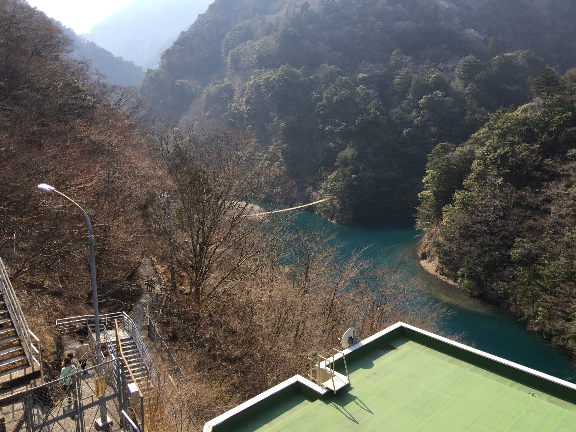これは渡るまで1時間はかかりそうということで、断念し、私とはっちゃん、ミッキーはさらに奥にある橋を目指す。この橋は吊橋ではないので、行列はなし。奥大井の深い渓谷と、遠くにかかる夢の吊り橋を眺めることができた。