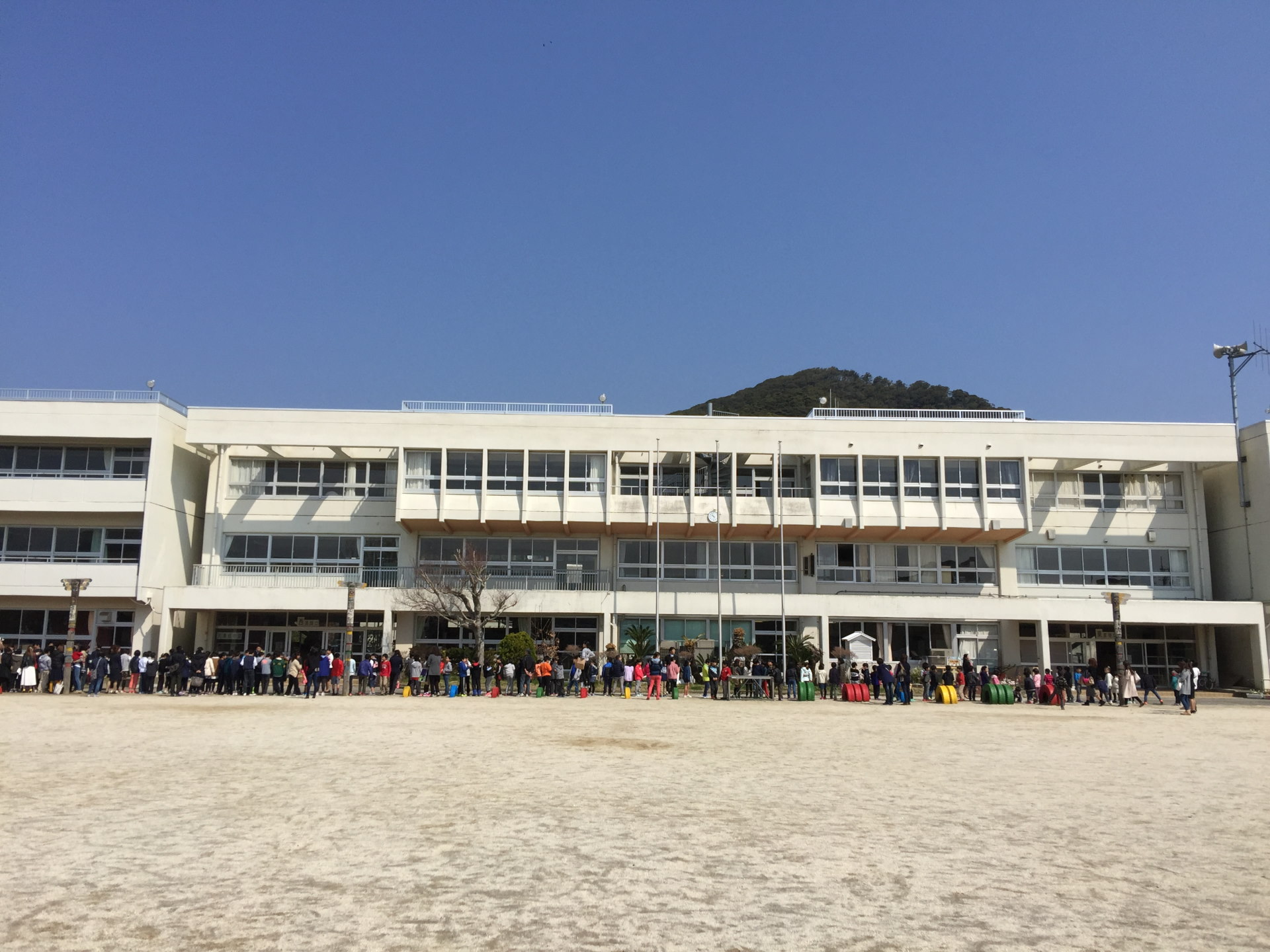 離任式が終わると、校舎前に長い列を作り、先生方を見送った。