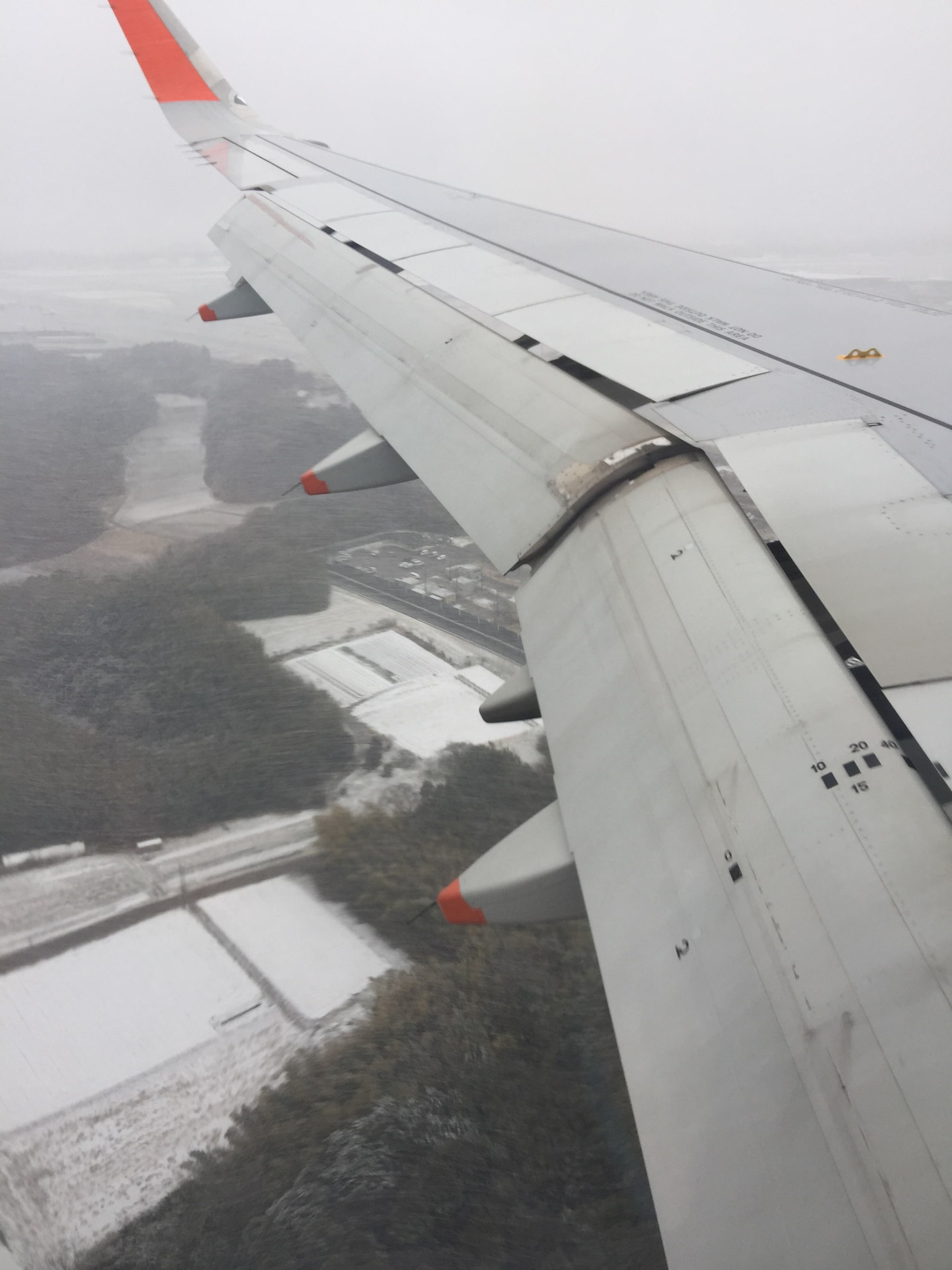 1時間ちょっとの短いフライトであったが、着陸前、窓から外を見るとなんだか天気が変だ。
