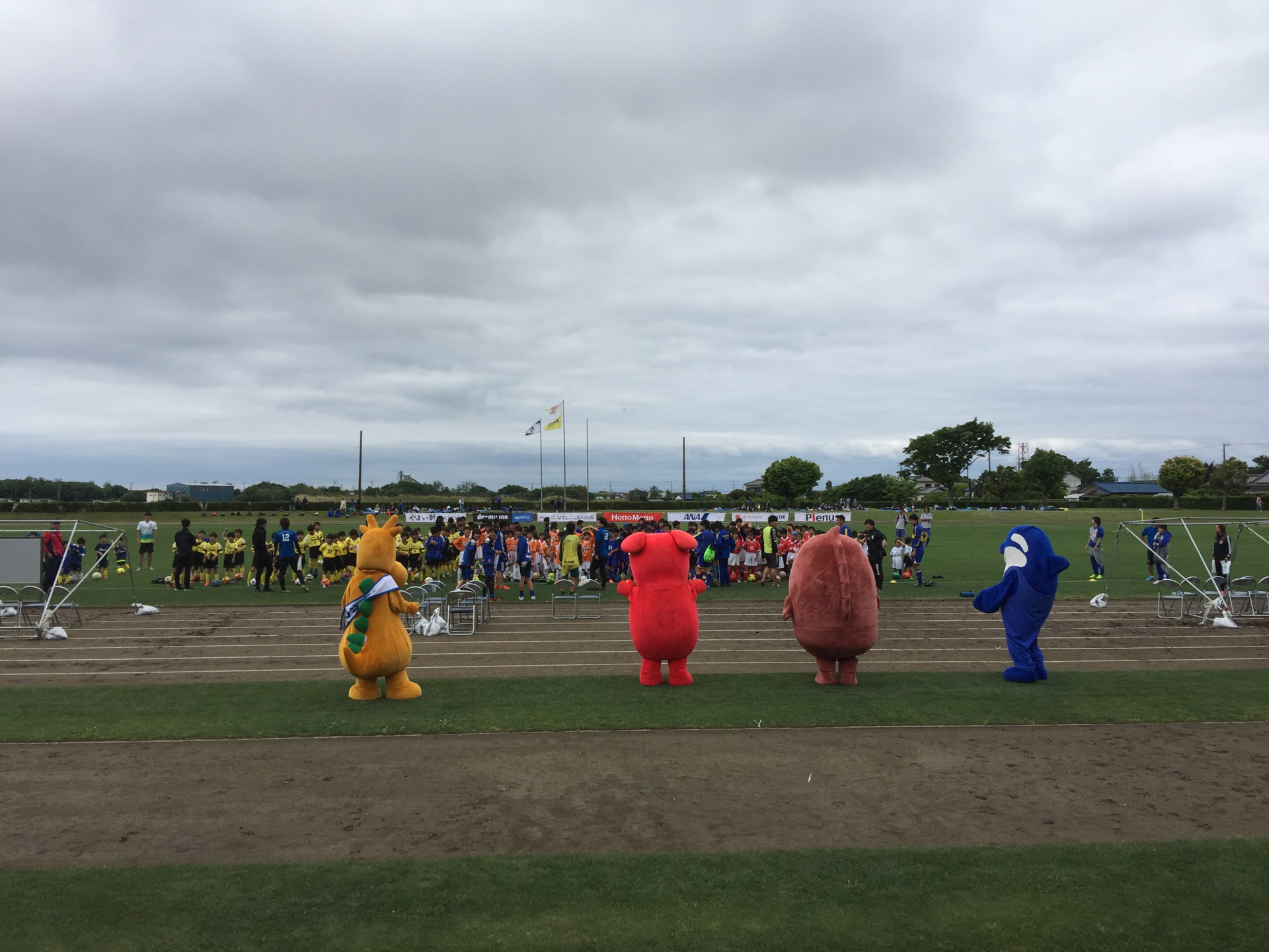 [写真:午前中のサッカークリニック。スペシャルゲストは松木安太郎さん。ゆるキャラも大集合!