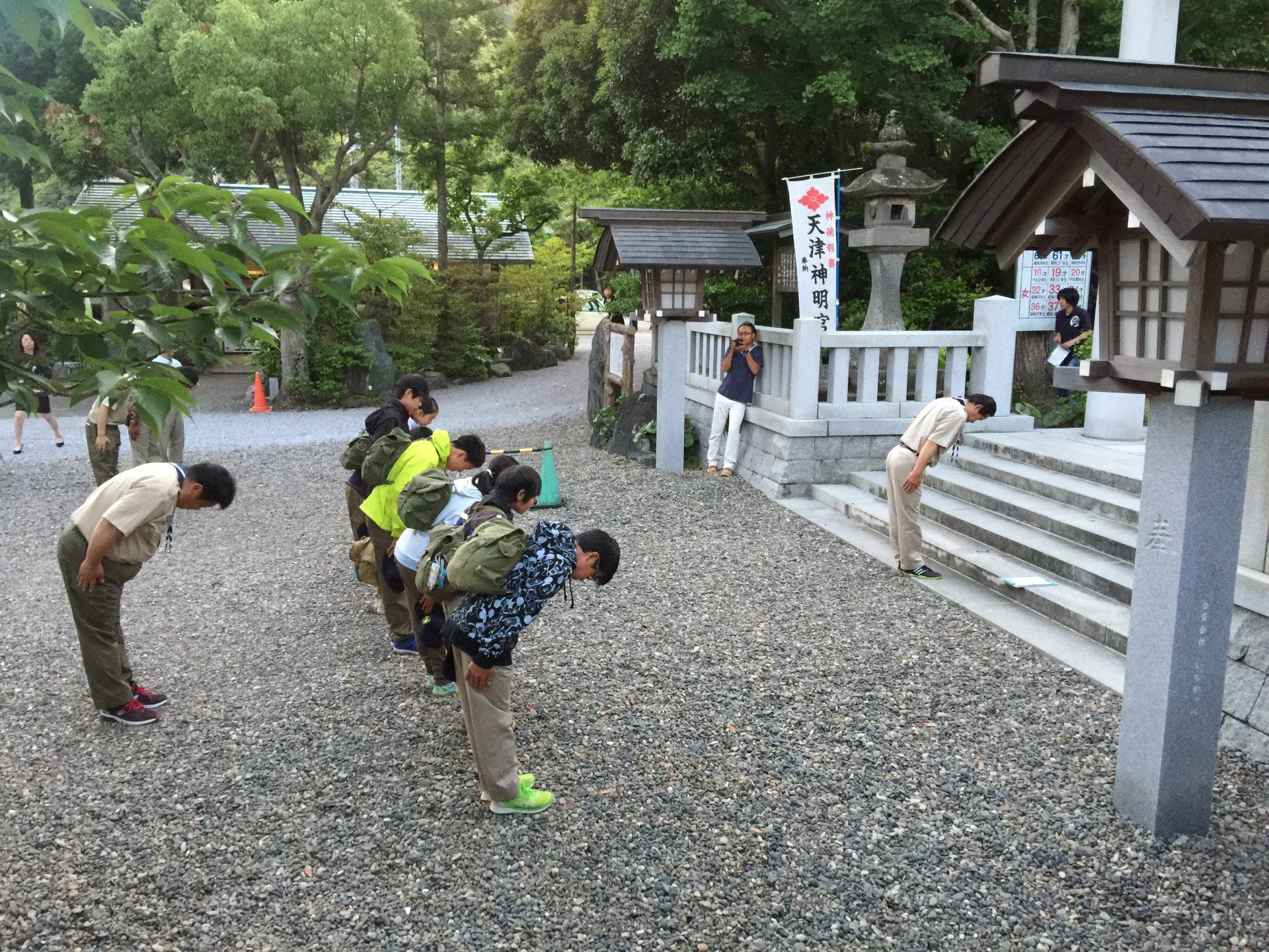 さて、片付けを終えると、今夜オーバーナイトハイクに挑戦するはっちゃんを見送りに神社へ戻る。