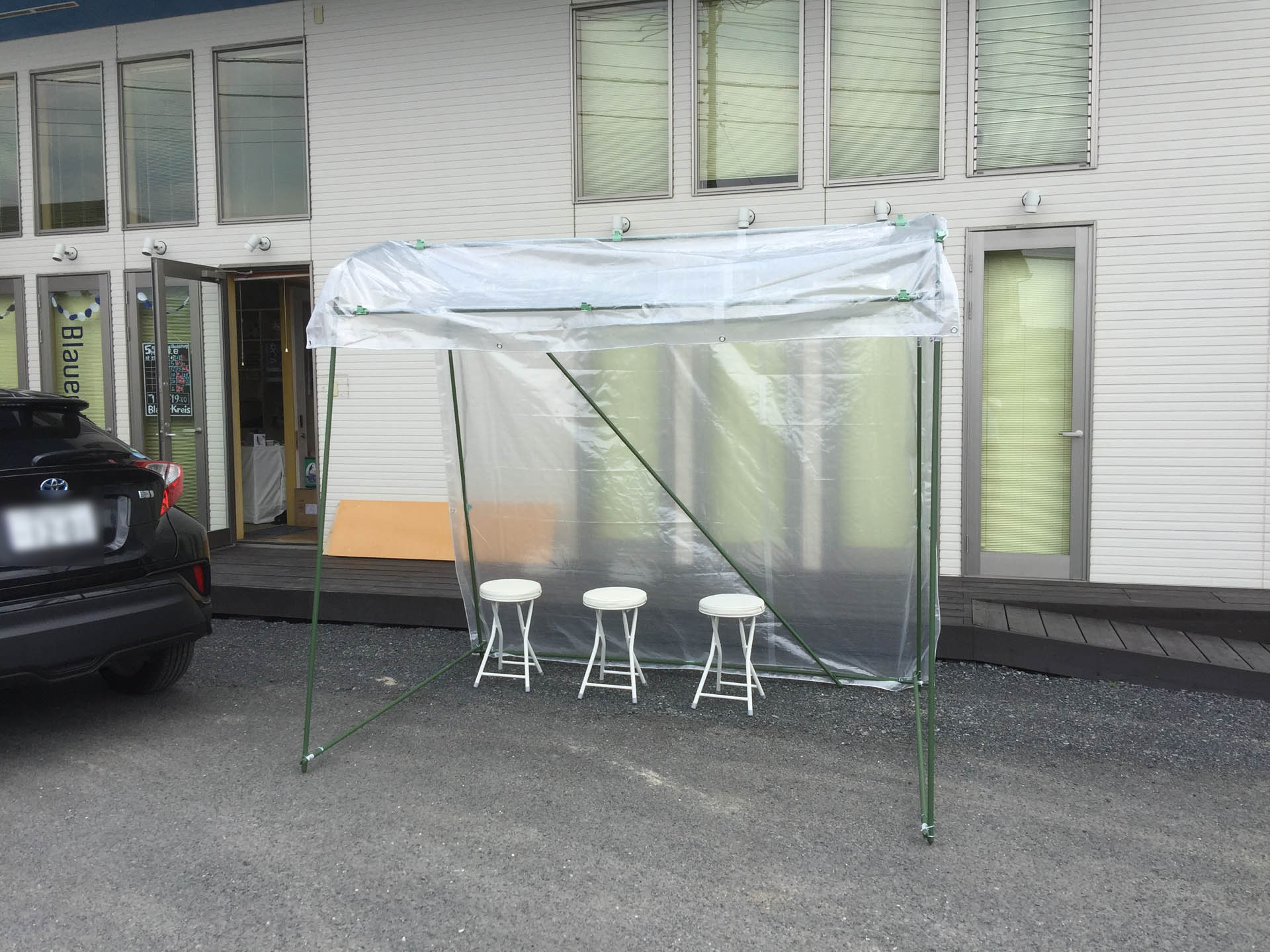 午前中、カインズホームに行って部材を買い足すと、ブラクラ前の駐車場にてベンチテント改良型の試作。