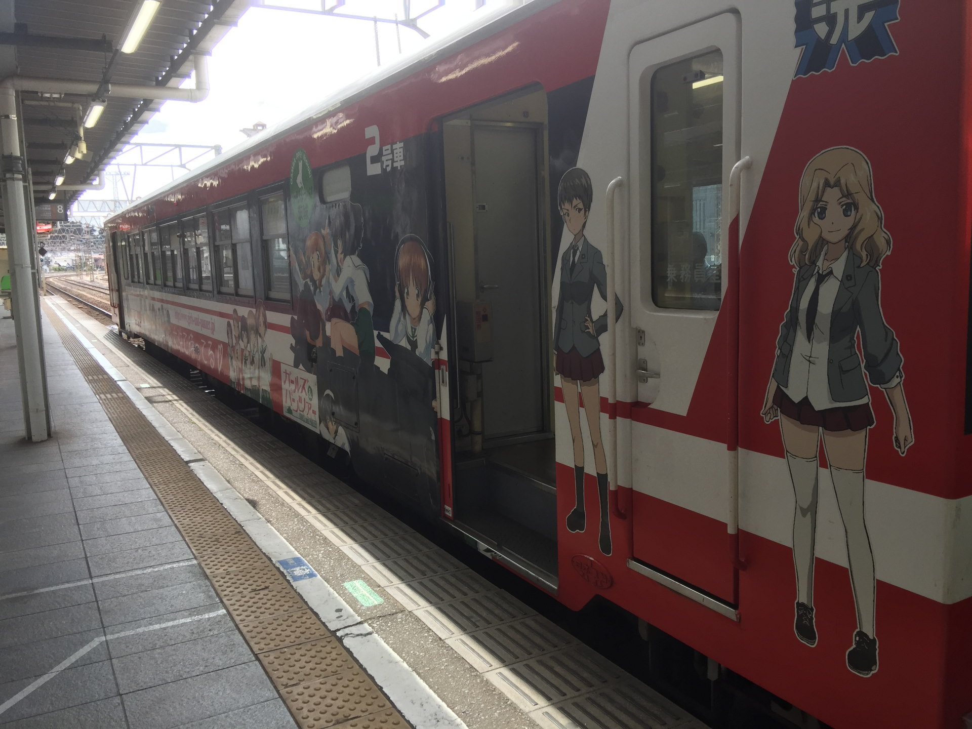平日だというのに、“ガルパン列車”にはガルパンファンがちらほら。あとから聞いたところによると、この日、キャラクターの誕生ミニイベントがあったらしいのだが、しかしながら、5年経過したいまでも平日にこれだけファンが来ているのだから大したもんだ。