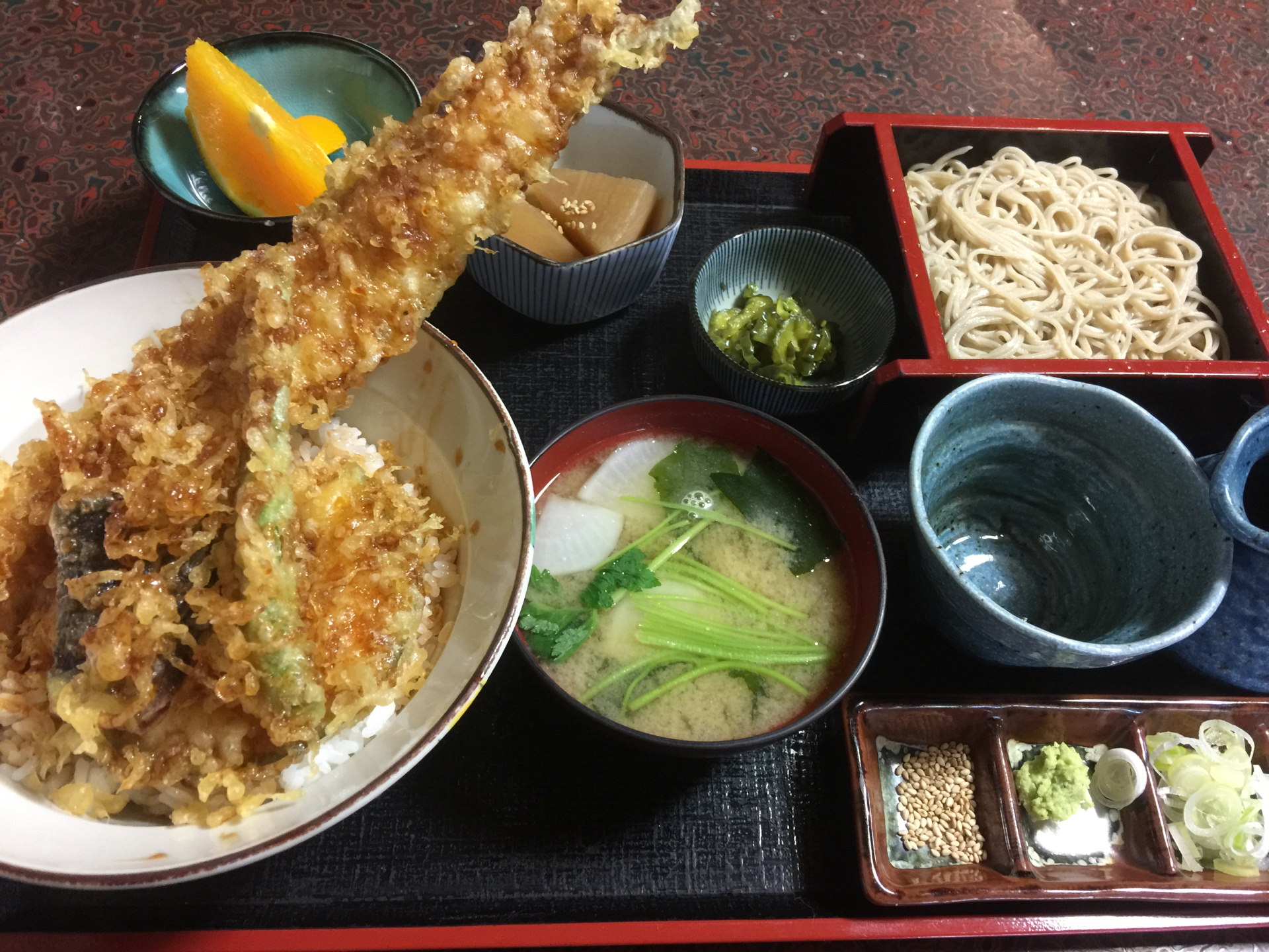[写真:昼食に立ち寄った「九拾九坊」のアナゴ天丼セット!