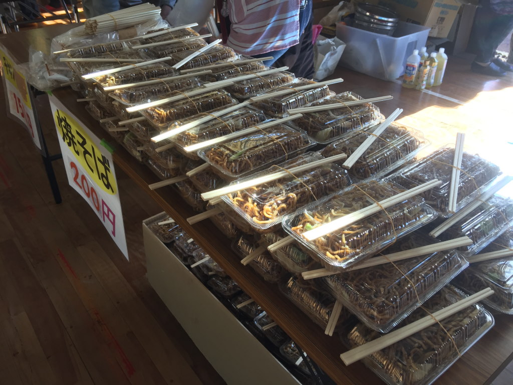 パパチームは例年のごとく、焼きそばを調理し、ママさんたちができあがった焼きそばを次々にパック詰めしていく。