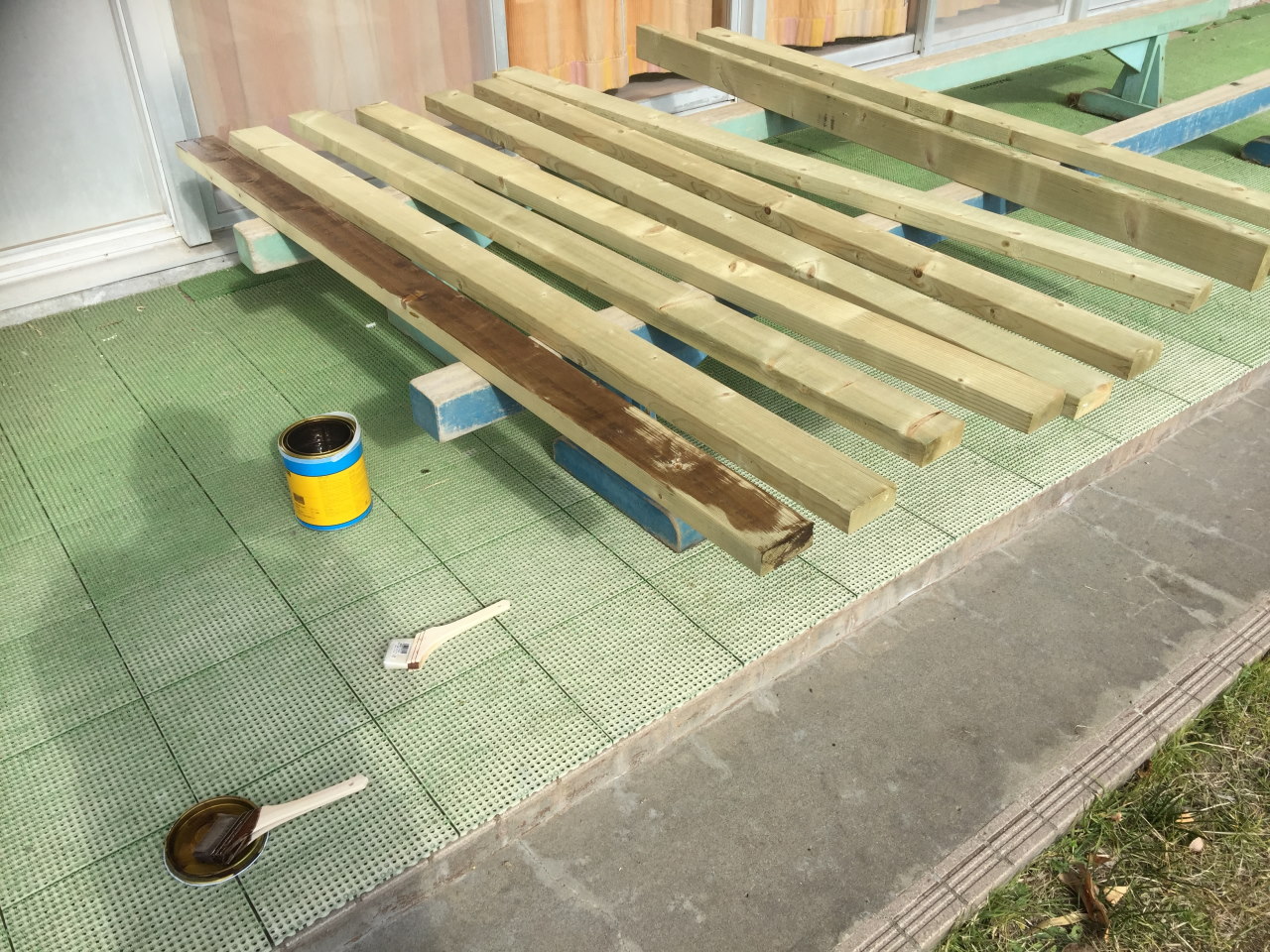 まずはカットした木材に防腐剤を塗布していく。