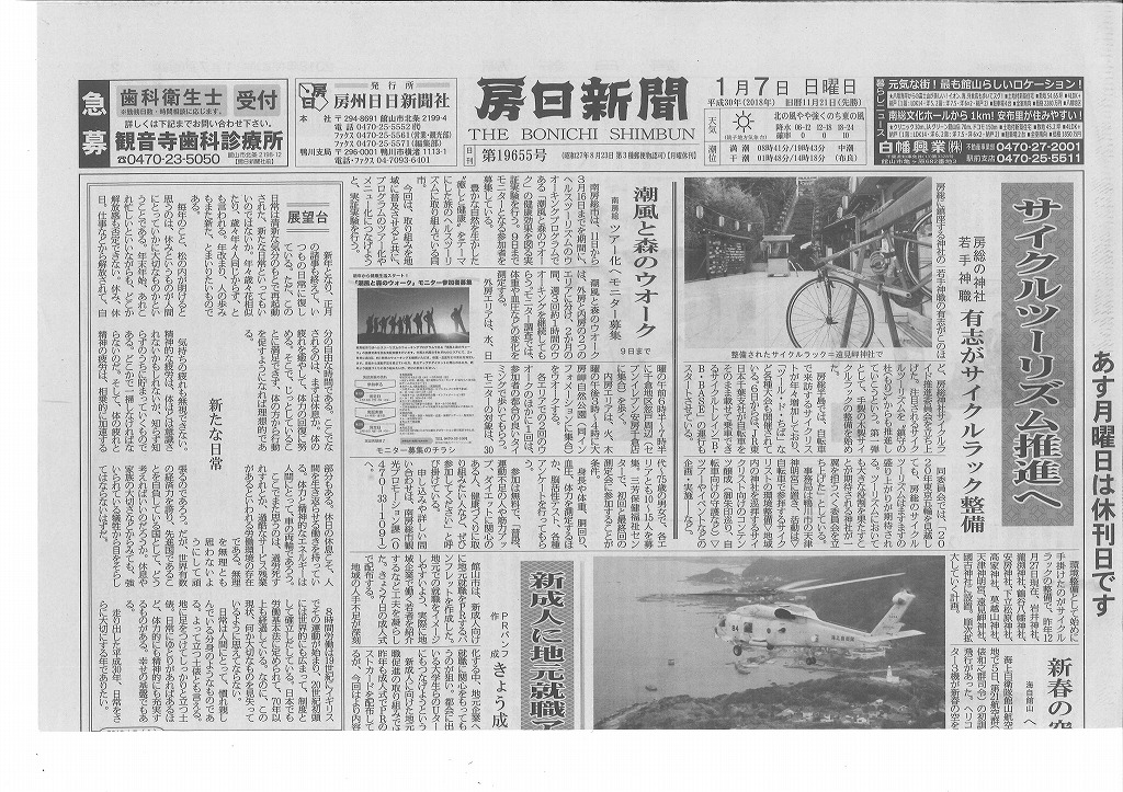 房日新聞では1面トップで房総神社サイクルライド推進委員会の取り組みに関する記事が大きく掲載された。