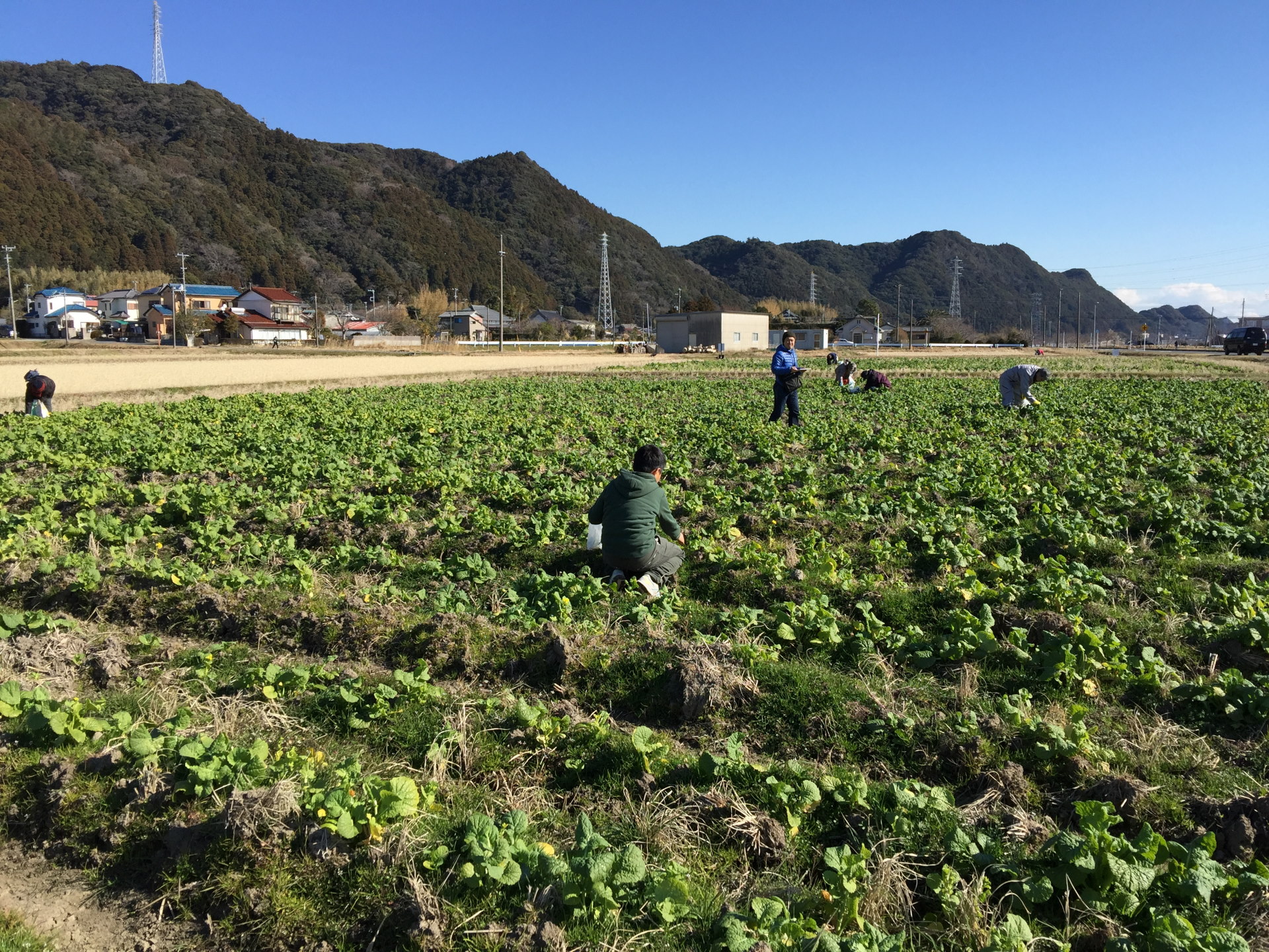 神社までの道のりで北部道路沿いで食用菜花摘みをする。地元営農組合の方々の厚意により、食用菜花が自由に摘み取れ、地元では有名になっていることもあって、今日も多くの方が菜花摘みに訪れていた。