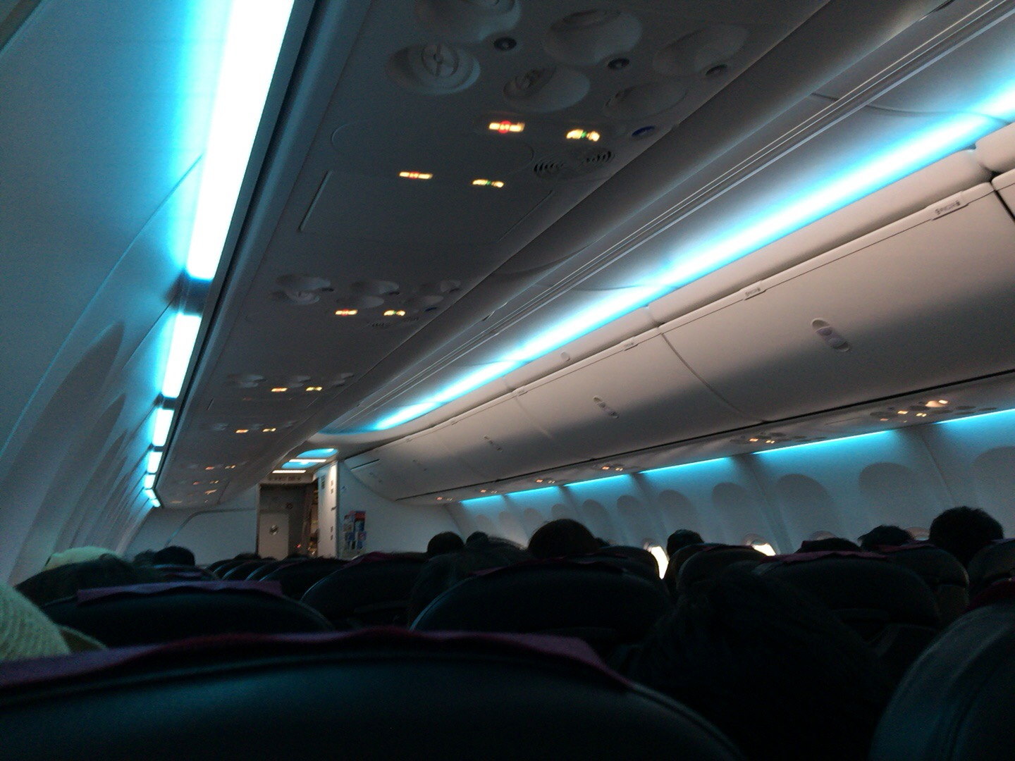 [写真:離陸時、室内灯を暗くするだけでなく「沖縄の海の青をイメージした」という青い光に。粋な演出のJTA