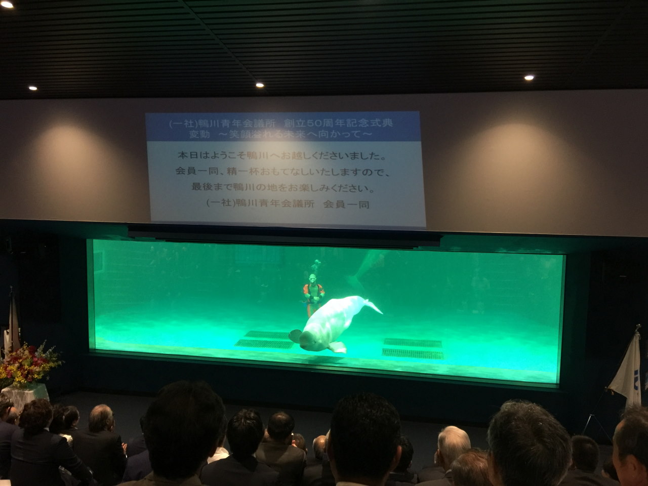 夕方5時30分から鴨川シーワールドを会場として行われた、鴨川青年会議所の創立50周年記念大会にOB会員として出席した。