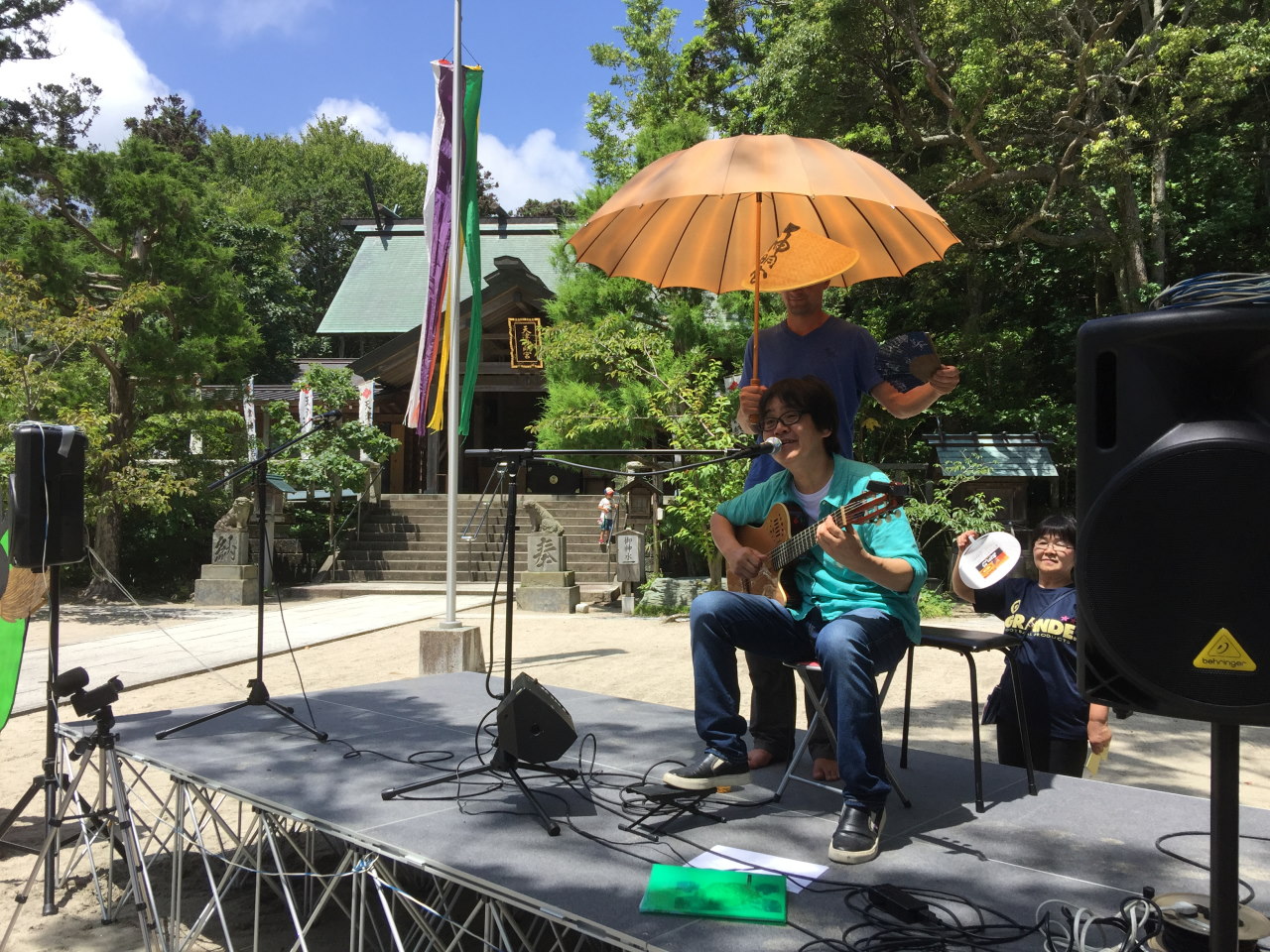 [写真:日傘を差してもらいつつ、ボサノバを熱唱する山辺さん