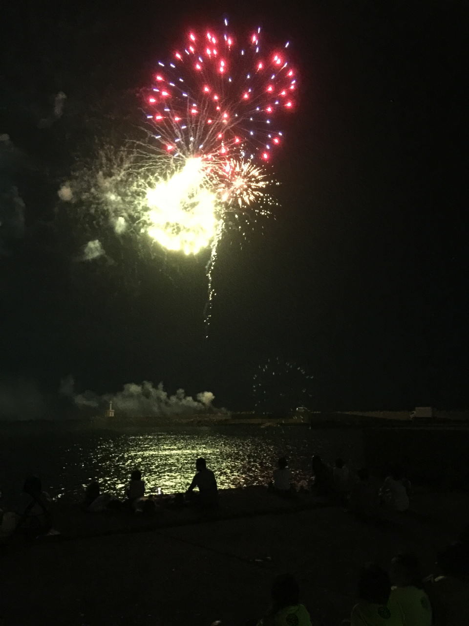 台風の波の影響で残念ながら舟万灯は出航できなかったが、間近で見れる打ち上げ花火に、一同は感動したようすだった。