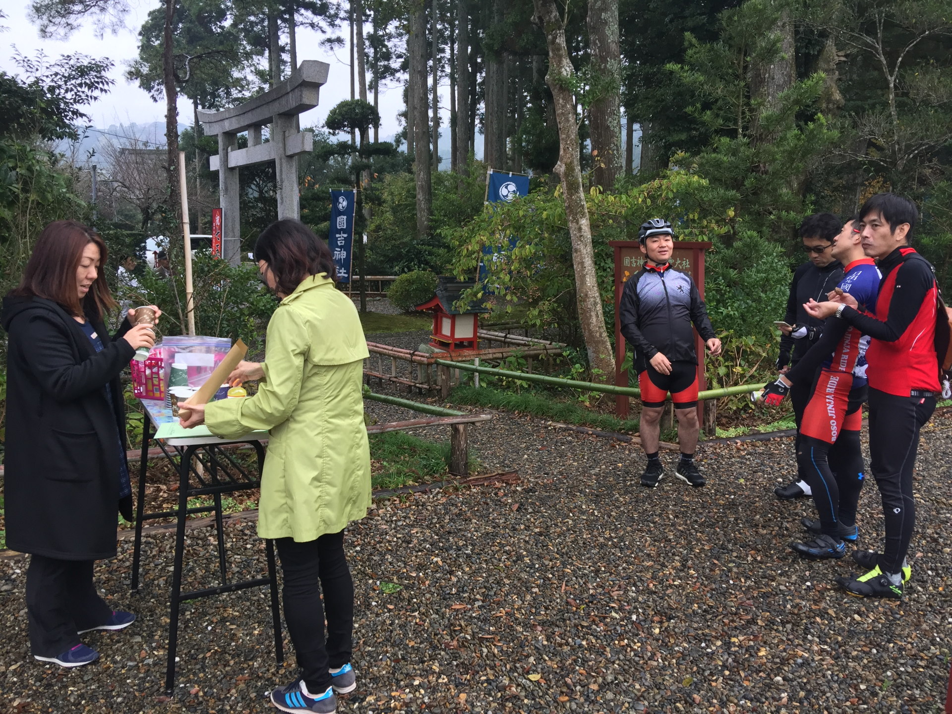 國吉神社に着く頃には雨も上がり、外房サイクルサポーターズのみなさんも来てくれて、なんとホットコーヒーとキャラメルのサービスが!特に地の牛乳を使ったキャラメルは疲れた体に染み入った。