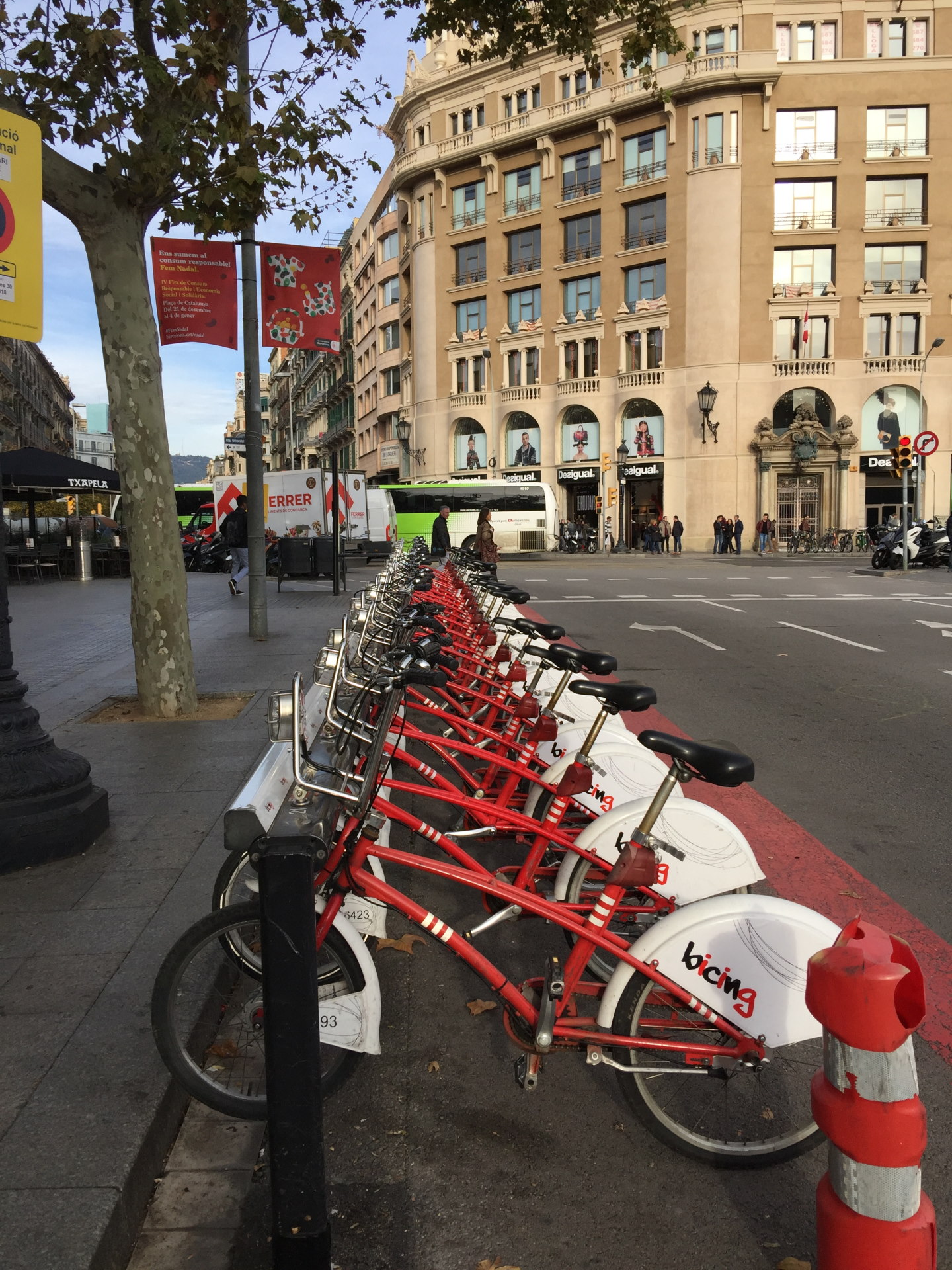 [写真:バルセロナのレンタサイクル無人ステーション。こちらは市民向けとのこと