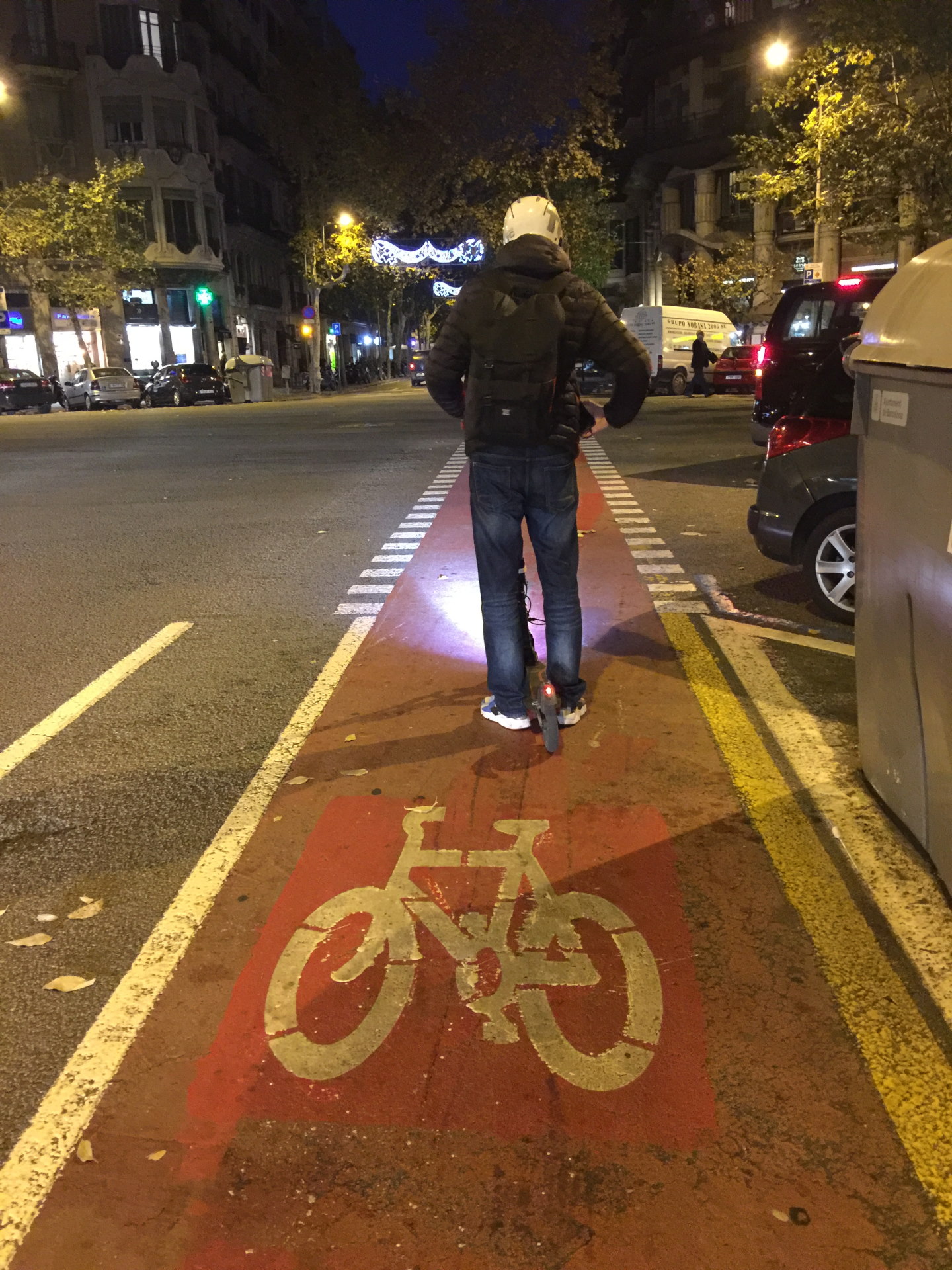 [写真:自転車専用レーン。前の男の人がもっているのは電動のストライダー。なんと80km/h出るそうだが、最近死亡事故が発生し、問題になっているという。