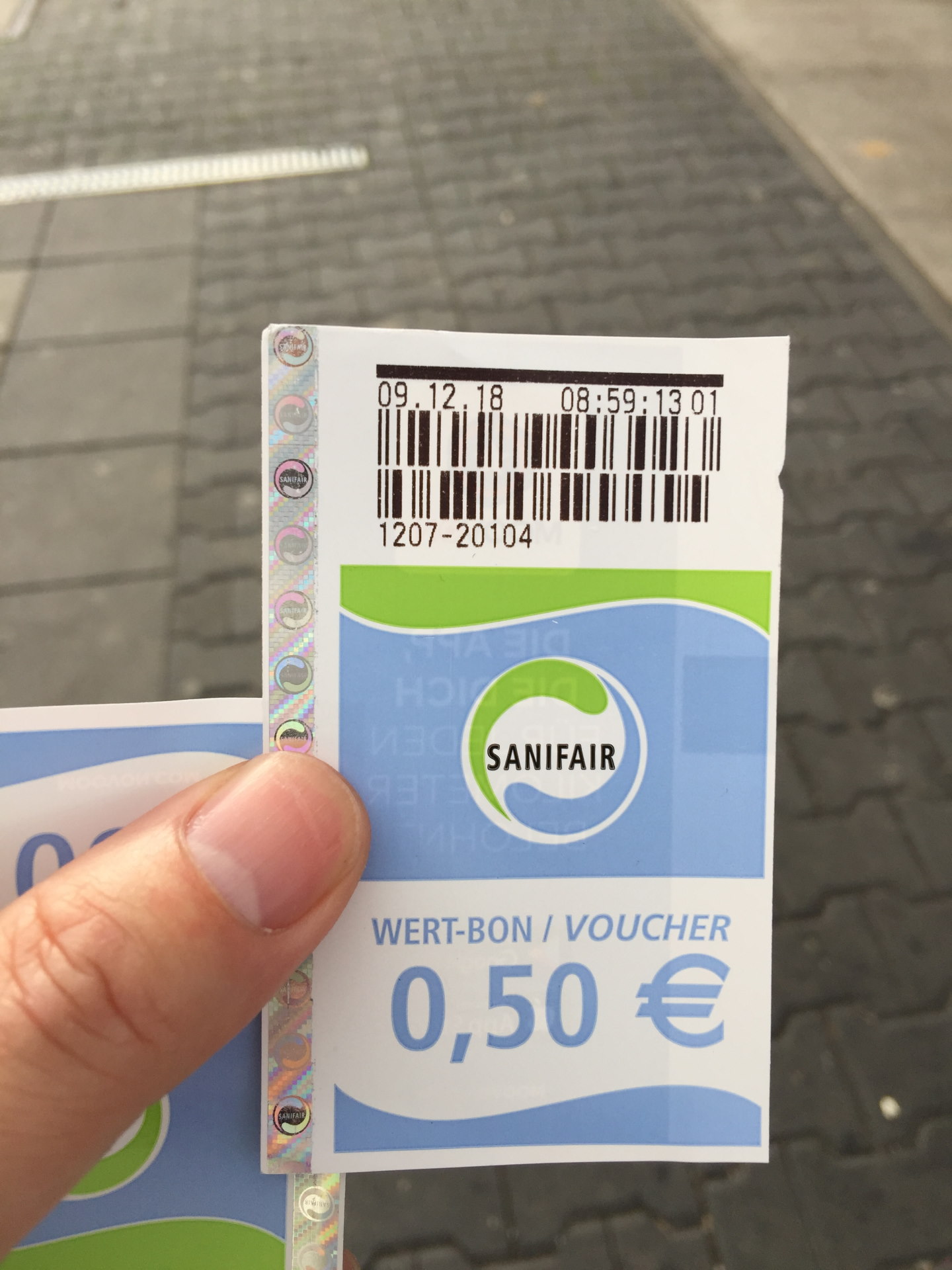 [写真:ドイツではアウトバーンの日本で言うサービスエリアの有料トイレを利用すると、0.7ユーロの利用料に対して、0.5ユーロの売店で使えるクーポンが返ってくる。なかなかおもしろい仕組みだと思う。