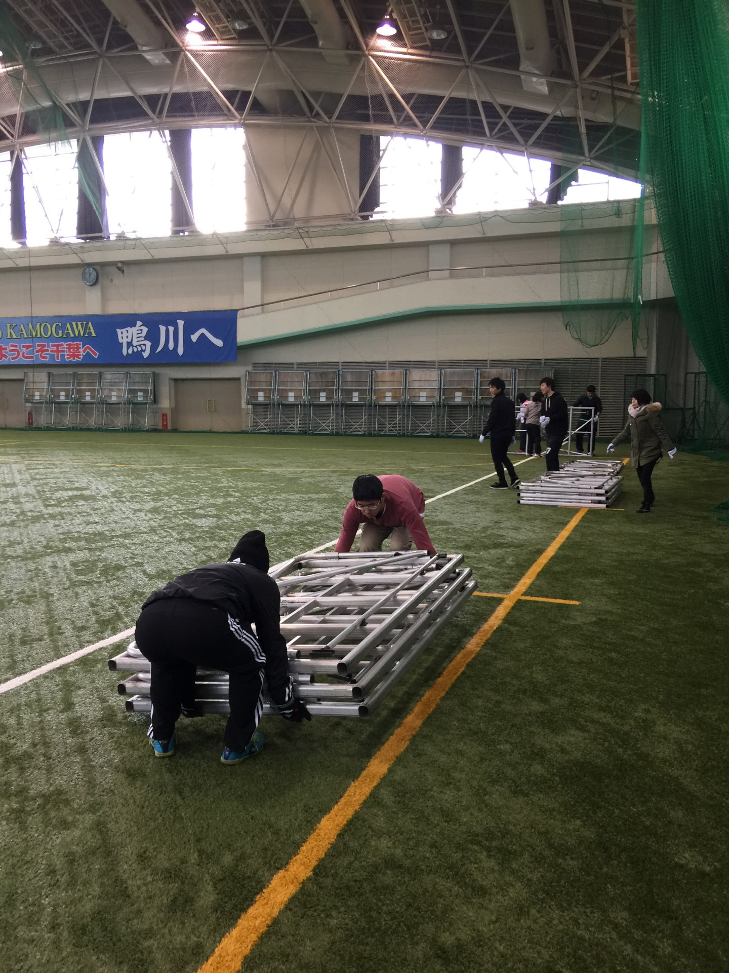 お昼前、選手たちも東京から到着し、ボランティアも集まって、さっそくサイドフェンスを設営し、練習会場づくりが行われた。