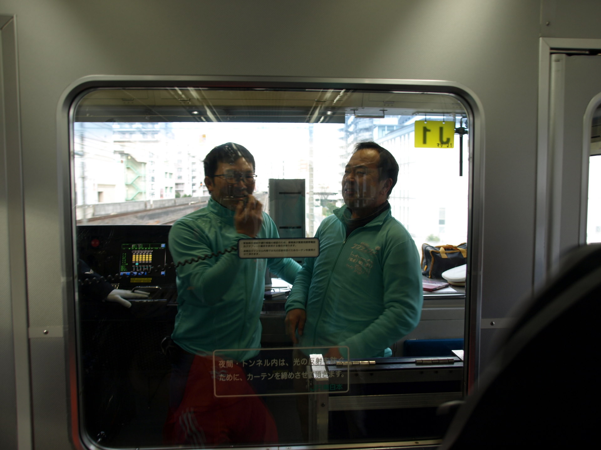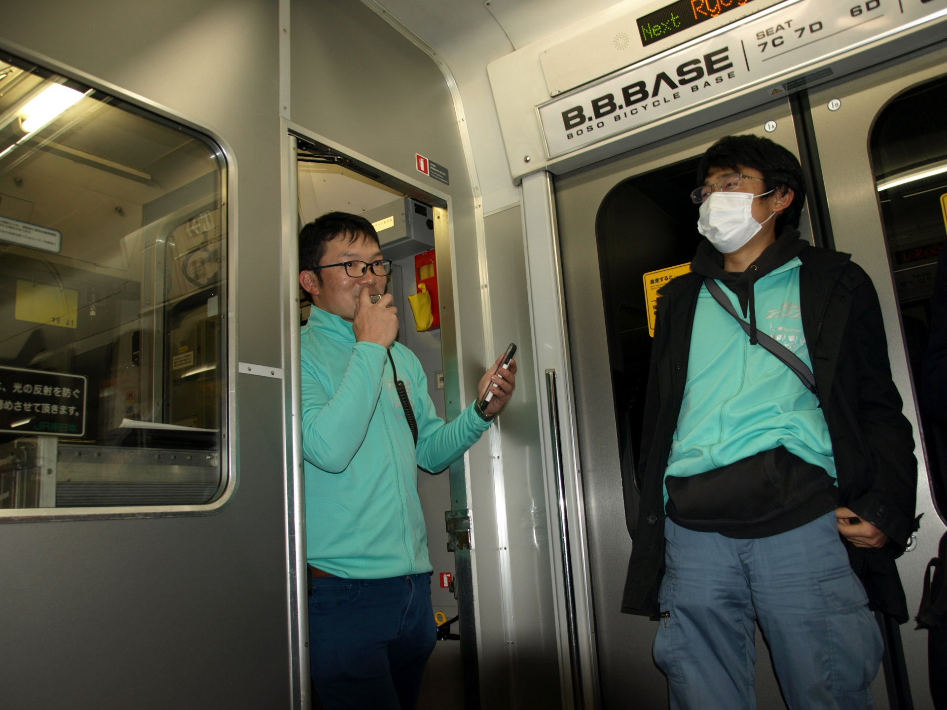 両国駅を出発すると、まずは車掌室にお邪魔して、諏訪プロデューサーと車内放送で参加者にご挨拶。
