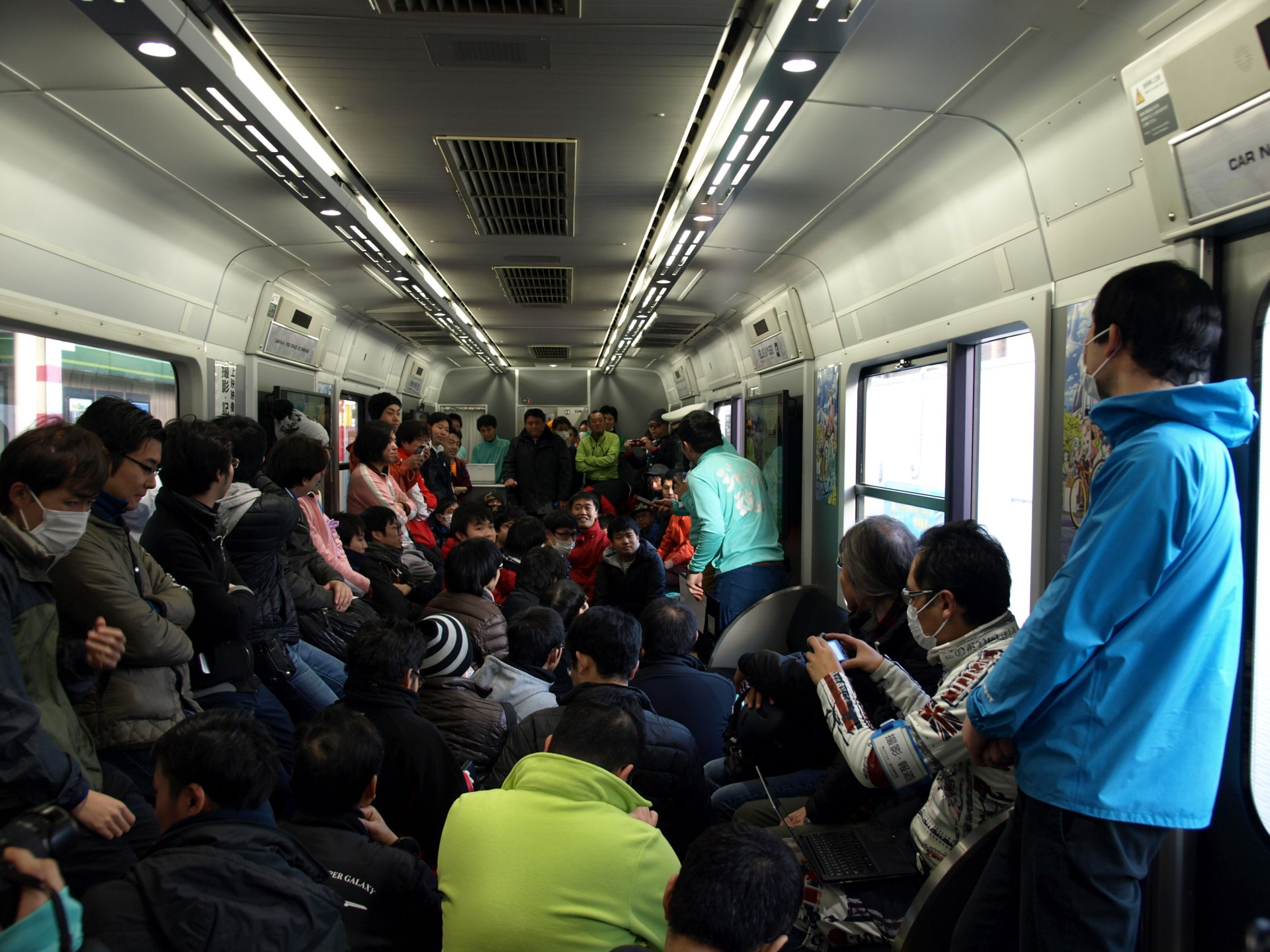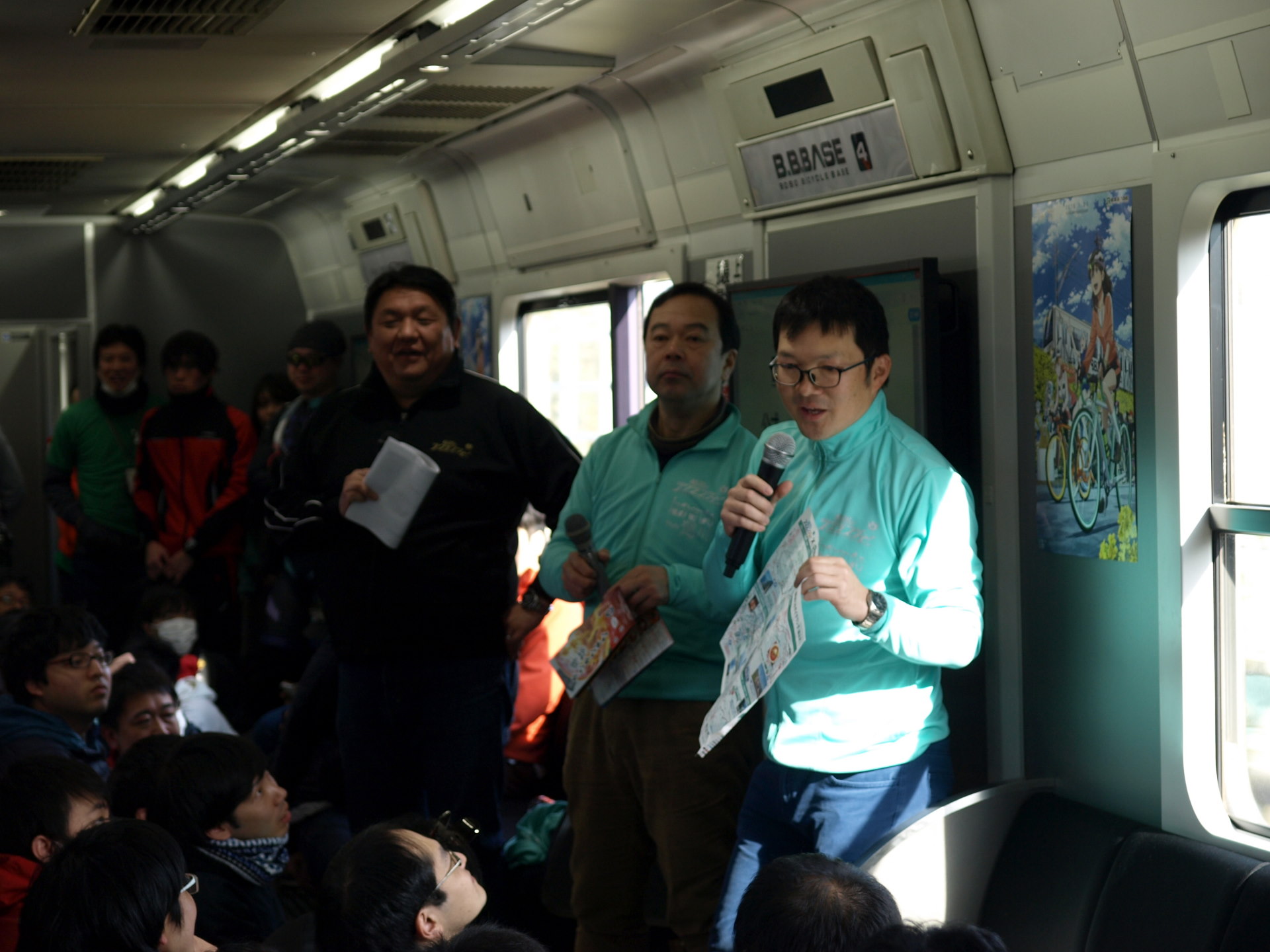 4号車には参加したファンが集まり、通勤列車さながらの満員状態。B.B.BASE運行開始から1周年を迎えているが、おそらく4号車がここまで熱気に包まれたのは初めてではないだろうか。笑