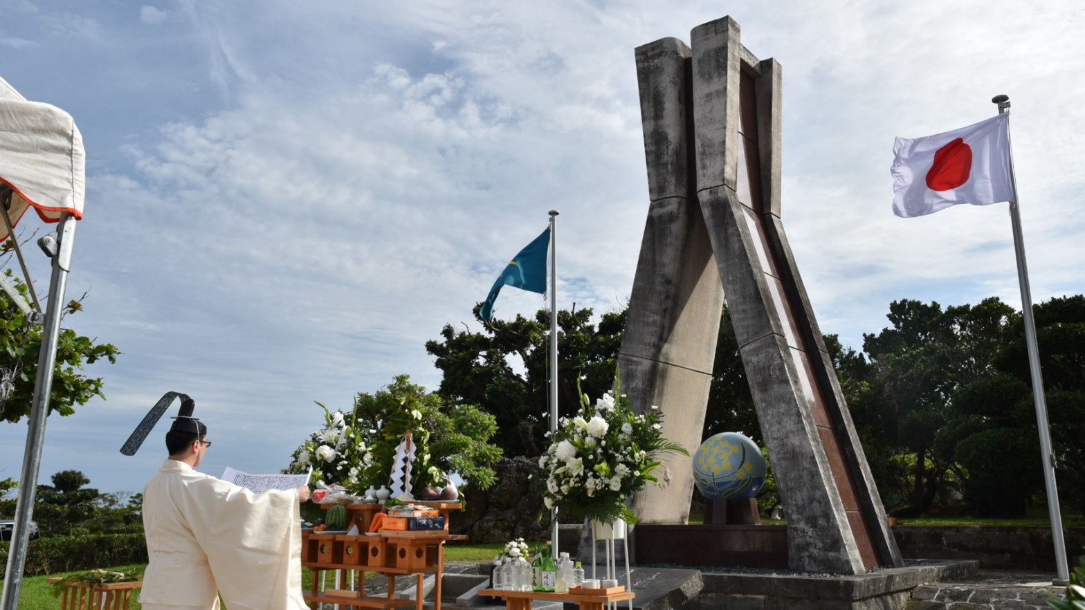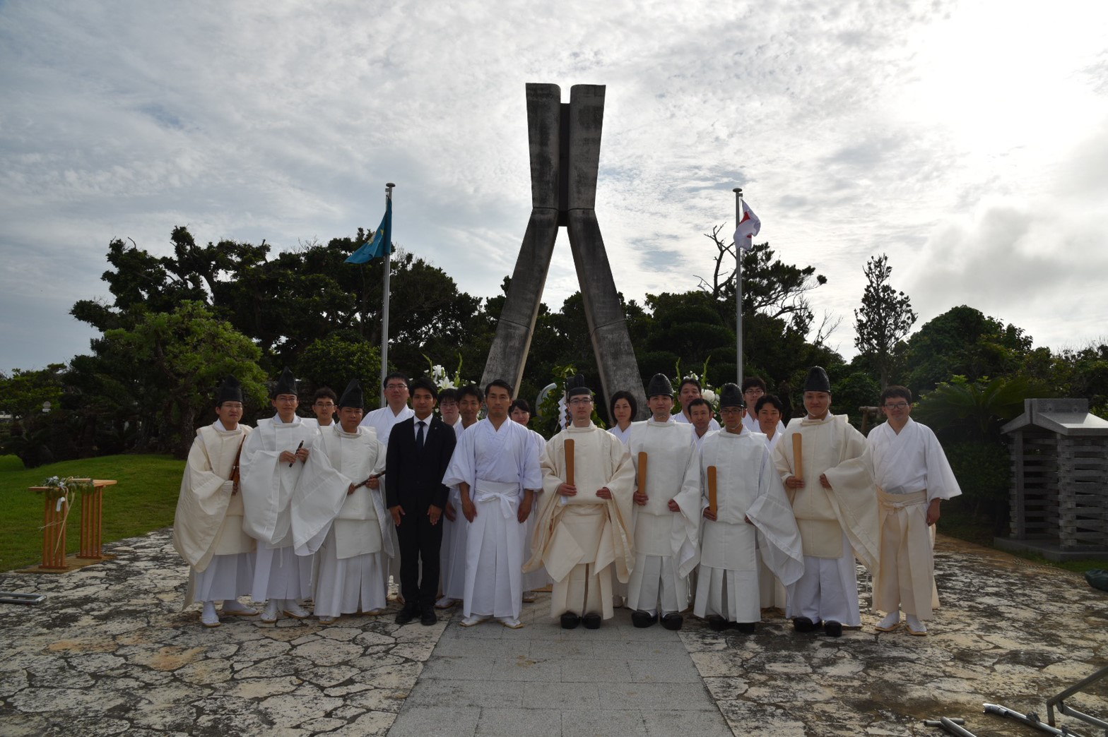 正式参拝をさせていただいた後、祭具をお借りして、糸満市の平和祈念公園内にある房総の塔に赴き、塔の前にて慰霊祭を斎行した。