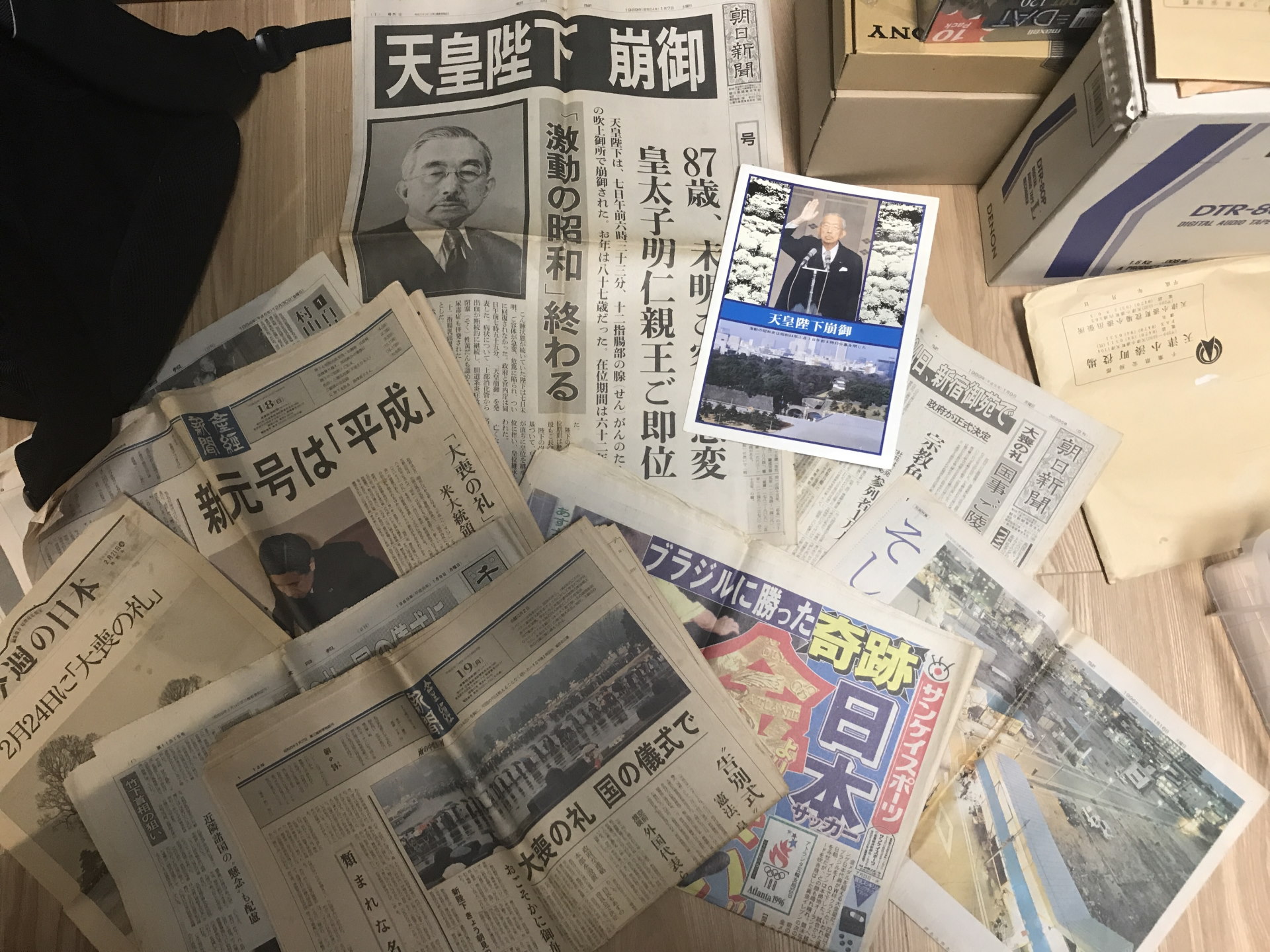 時代が昭和から平成に移り変わった、昭和天皇崩御、新元号平成を報ずるまさに歴史的な節目の新聞。