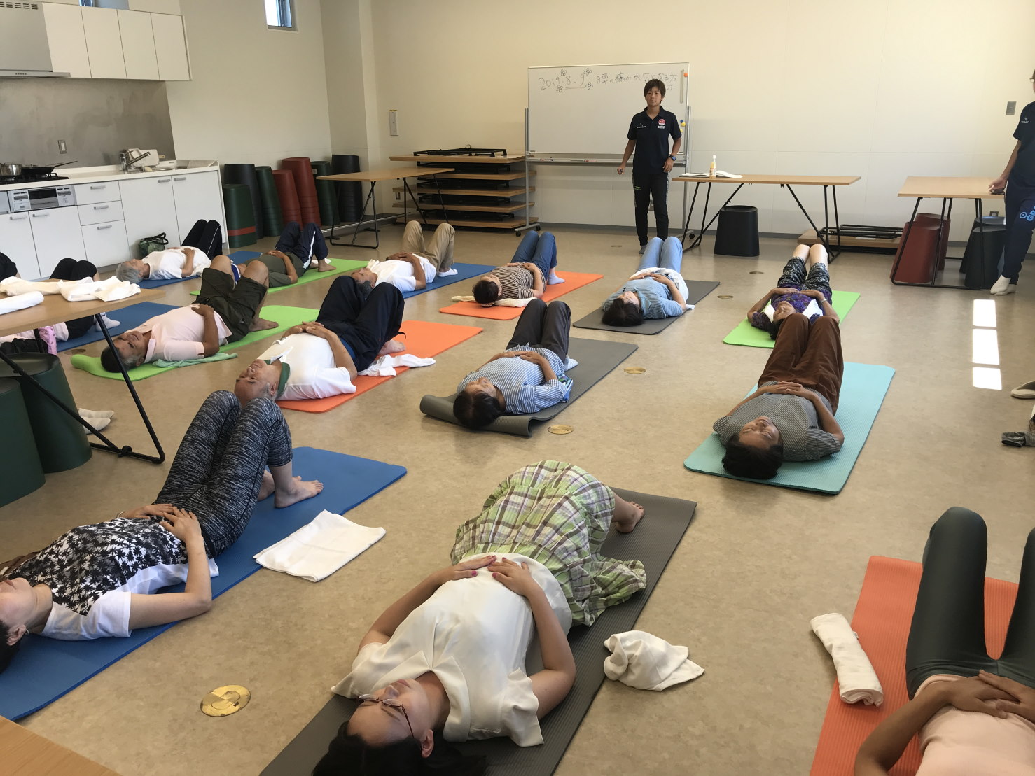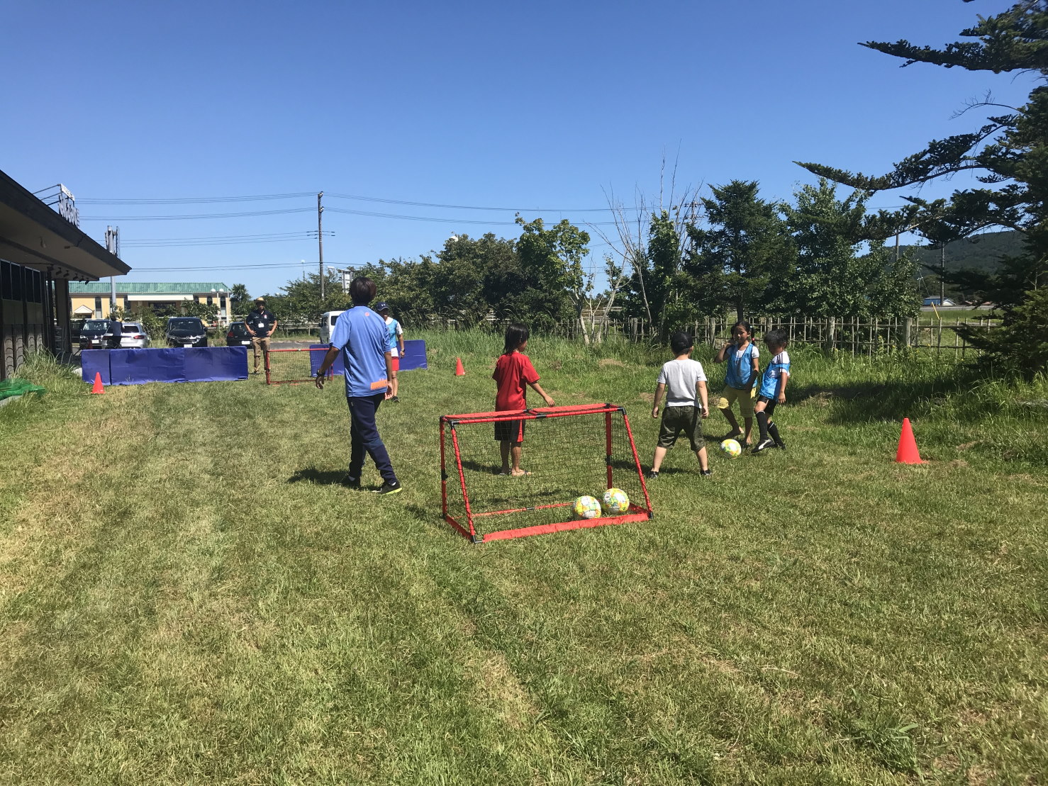 今日は午前の部は大人向けのストレッチを主体とした「ウェルKAMO教室」、午後は子ども向けの「ウェルKAMOイベント」でミニサッカーコーナーを開いた。